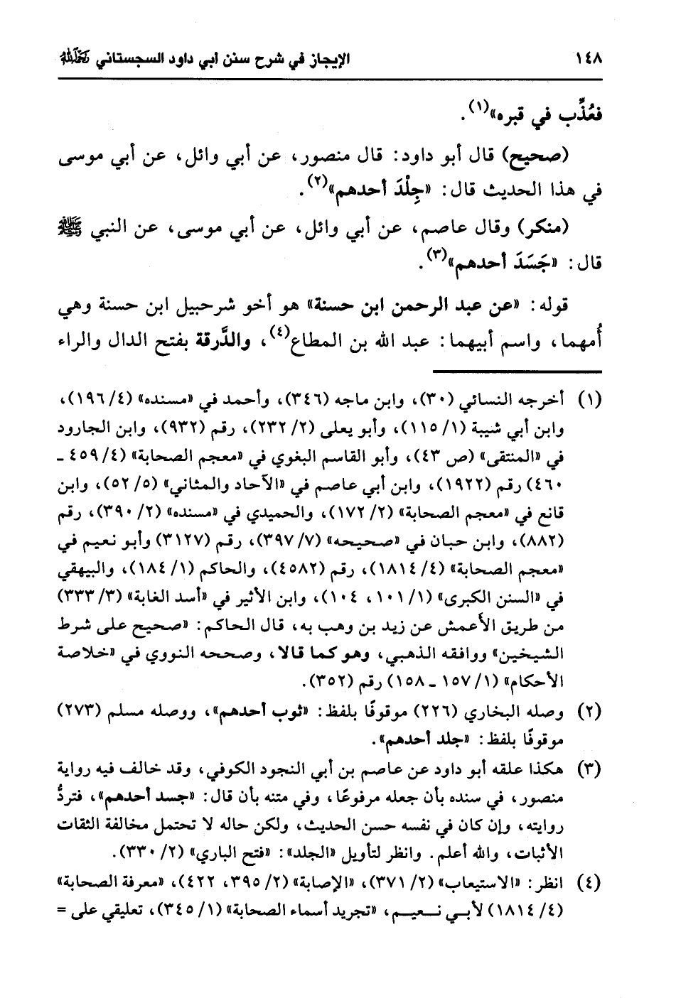 (¬3) هكذا علقه أبو داود عن عاصم بن أبي النجود الكوفي، وقد خالف فيه رواية منصور، في سنده بأن جعله مرفوعًا، وفي متنه بأن قال: "جسد أحدهم"، فتردُّ روايته، وإن كان في نفسه حسن الحديث، ولكن حاله لا تحتمل مخالفة الثقات الأثبات، والله أعلم. وانظر لتأويل "الجلد": "فتح الباري" (2/ 330).