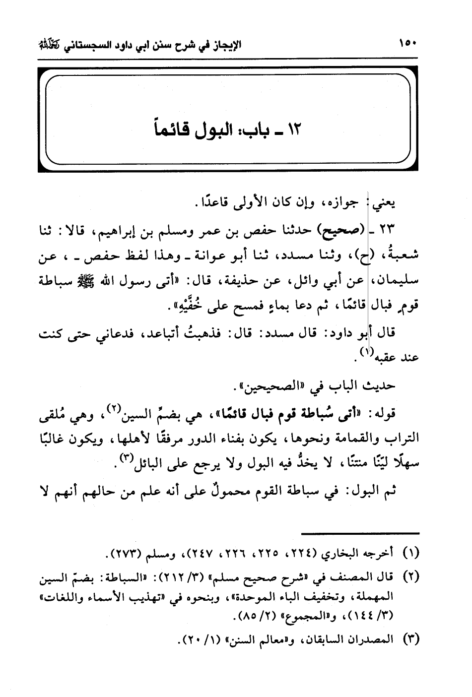 23 - (صحيح) حدثنا حفص بن عمر ومسلم بن إبراهيم، قالا: ثنا شعبةُ، (ح)، وثنا مسدد، ثنا أبو عوانة -وهذا لفظ حفص-، عن سليمان، عن أبي وائل، عن حذيفة، قال: "أتى رسول الله - صلى الله عليه وسلم - سباطة قومٍ فبال قائمًا، ثم دعا بماءٍ فمسح على خُفَّيْهِ".