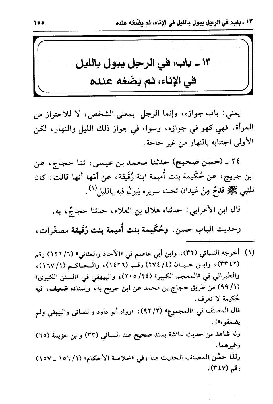 24 - (حسن صحيح) حدثنا محمد بن عيسى، ثنا حجاج، عن ابن جريج، عن حُكَيمة بنت أُميمة ابنة رُقَيقة، عن أمّها أنها قالت: كان للنبي - صلى الله عليه وسلم - قدحٌ مِنْ عَيدان تحت سريره يَبولُ فيه بالليل (¬1).
