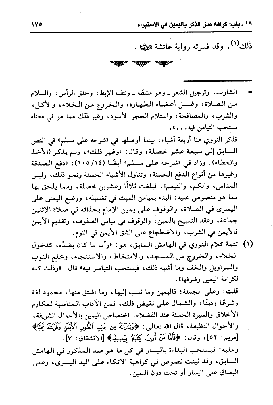 (¬1) تتمة كلام النووي في الهامش السابق، هو: "وأما ما كان بضدّه، كدخول الخلاء، والخروج من المسجد، والامتخاط، والاستنجاء، وخلع الثوب والسراويل والخف وما أشبه ذلك، فيستحب التياسر فيه" قال: "وذلك كله لكرامة اليمين وشرفها".