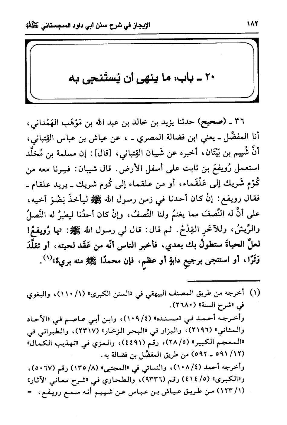36 - (صحيح) حدثنا يزيد بن خالد بن أبو عبد الله بن مَوْهَب الهَمْداني، أنا المفضَّل -يعني ابن فضالة المصري-، عن عياش بن عباس القِتباني، أنَّ شُييم بن بَيْتَان، أخبره عن شَيبان القِتباني، [قال]: إن مسلمة بن مُخلَّد استعمل رُويفعَ بن ثابت على أسفل الأرض. قال شيبان: فسِرنا معه من كُوْم شَريك إلى عَلْقَماء، أو من علقماء إلى كُوم شريك -يريد علقام- فقال رويفع: إنْ كان أحدنا في زمن رسول الله - صلى الله عليه وسلم - ليأخذَ نِضْوَ أخيه، على أنَّ له النِّصفَ مما يغنمُ ولنا النَّصفُ، وإنْ كان أحدُنا ليطيرُ له النَّصلُ والرِّيشُ، وللآخَرِ القِدْحُ. ثم قال: قال لي رسول الله - صلى الله عليه وسلم -: "يا رُويفعُ! لعلَّ الحياةَ ستطولُ بك بعدي، فأخبر الناس أنّه من عَقَد لحيته، أو تقلَّدَ وَتَرًا، أو استنجى برجيعٍ دابةٍ أو عظمٍ، فإن محمدًا - صلى الله عليه وسلم - منه بريءٌ" (¬1).