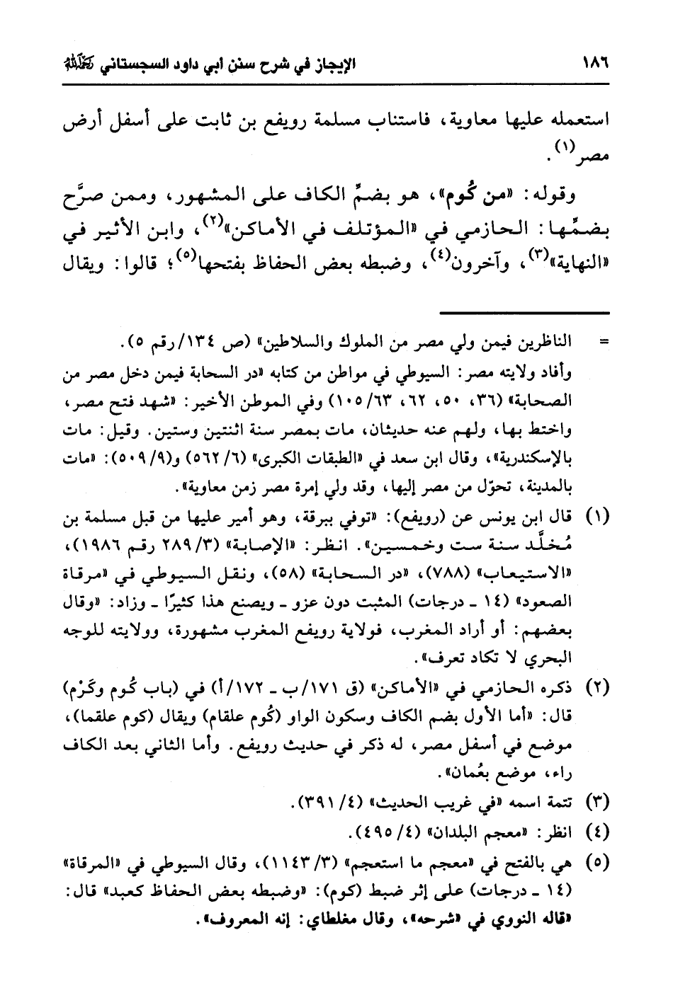 (¬5) هي بالفتح في "معجم ما استعجم" (3/ 1143)، وقال السيوطي في "المرقاة" (14 - درجات) على إثر ضبط (كوم): "وضبطه بعض الحفاظ كعبد" قال: "قاله النووي في "شرحه"، وقال مغلطاي: إنه المعروف".