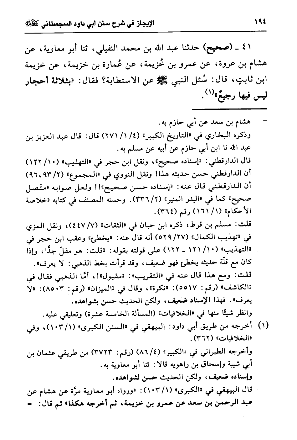 41 - (صحيح) حدثنا أبو عبد الله بن محمد النفيلي، ثنا أبو معاوية، عن هشام بن عروة، عن عمرو بن خُزيمة، عن عُمارة بن خزيمة، عن خزيمة ثابتٍ، قال: سُئل النبي - صلى الله عليه وسلم - عن الاستطابة؟ فقال: "بثلاثة أحجار ليس فيها رجيعٌ" (¬1).