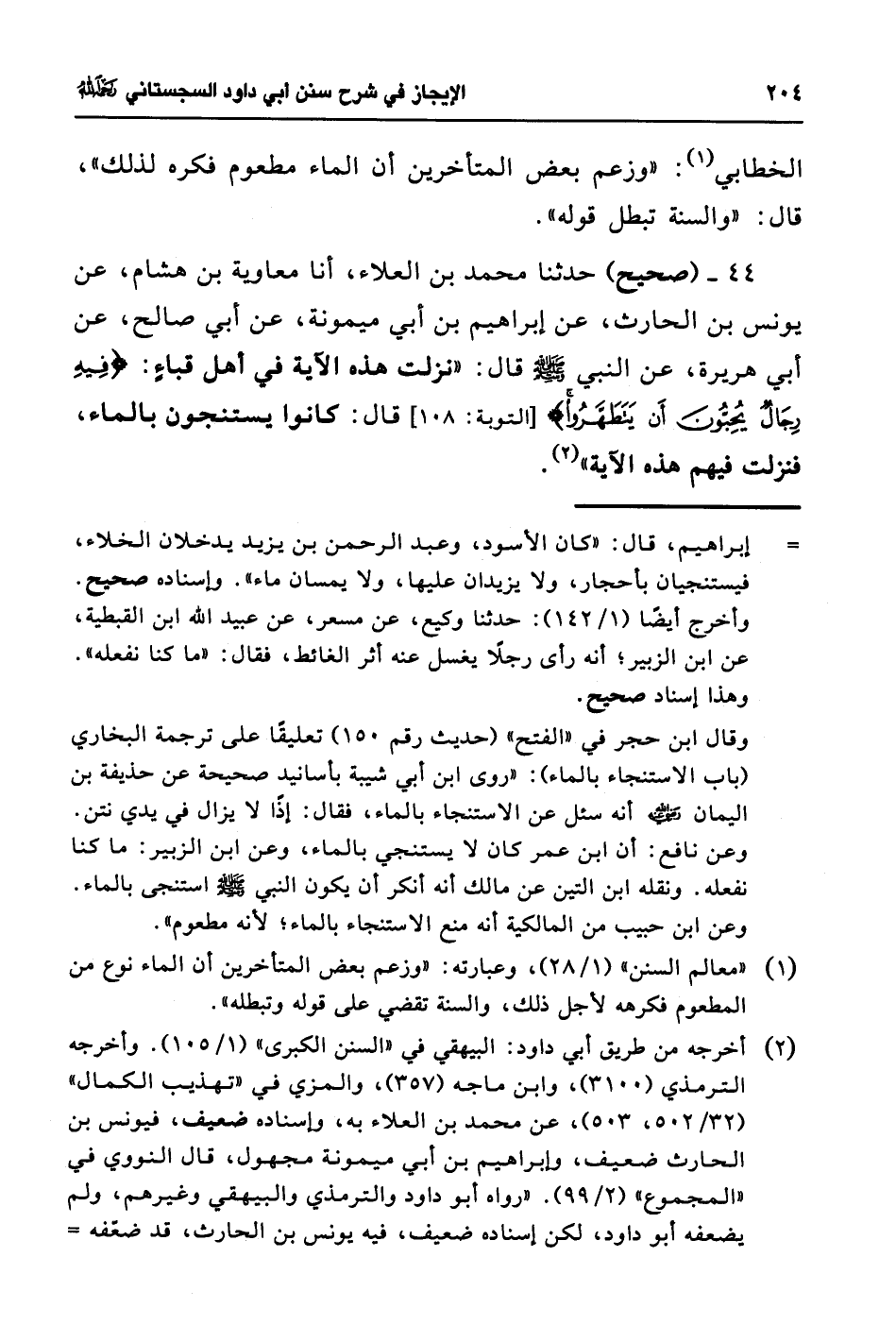 44 - (صحيح) حدثنا محمد بن العلاء، أنا معاوية بن هشام، عن يونس بن الحارث، عن إبراهيم بن أبي ميمونة، عن أبي صالح، عن أبي هريرة، عن النبي - صلى الله عليه وسلم - قال: "نزلت هذه الآية في أهل قباءٍ: {فِيهَ رِجَالٌ يُحِبُّونَ أَن يَتَطَهَرُوا} [التوبة: 108] قال: كانوا يستنجون بالماء، فنزلت فيهم هذه الآية" (¬2).
