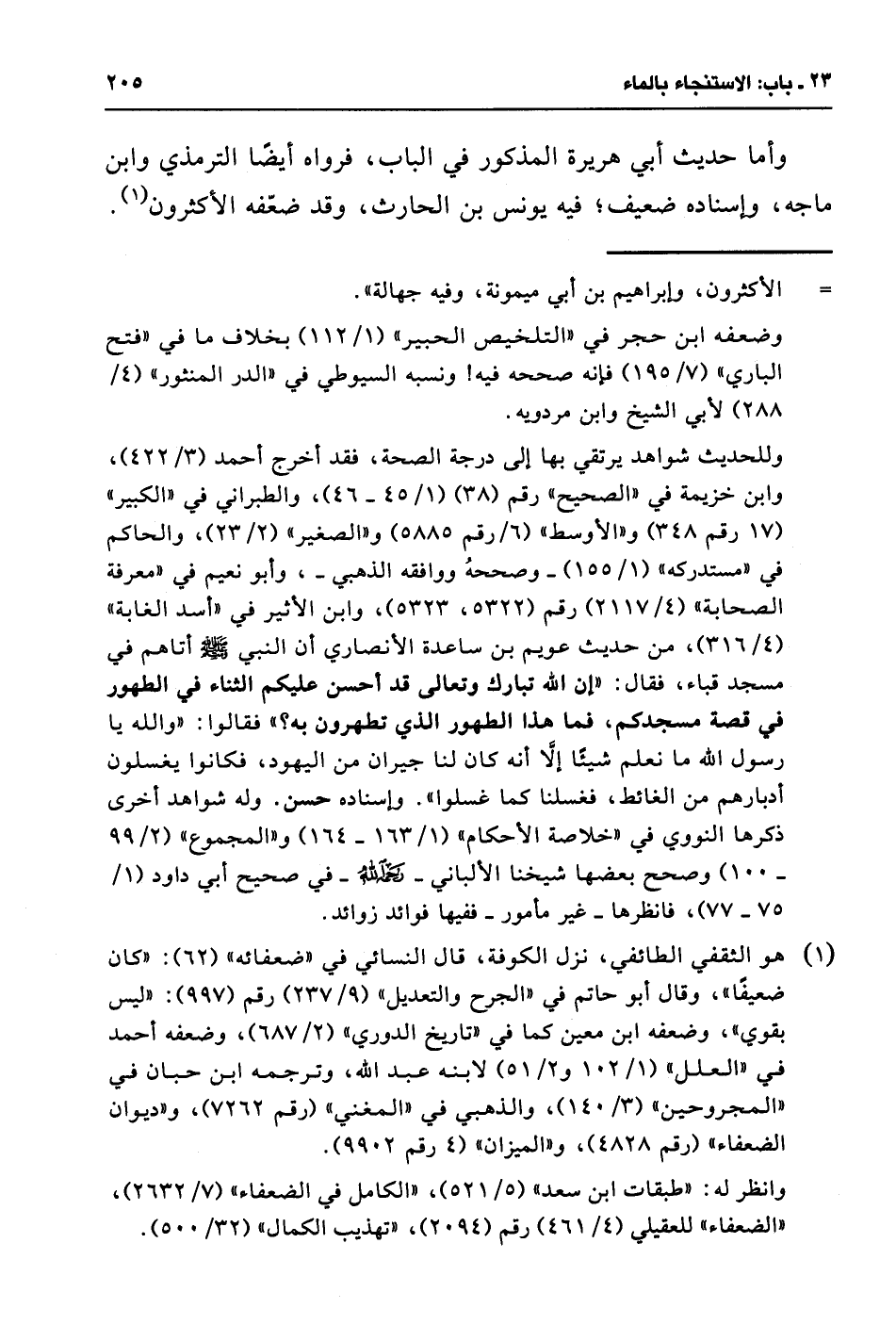 وللحديث شواهد يرتقي بها إلى درجة الصحة، فقد أخرج أحمد (3/ 422)، وابن خزيمة في "الصحيح" رقم (38) (1/ 45 - 46)، والطبراني في "الكبير" (17 رقم 348) و"الأوسط" (6/ رقم 5885) و"الصغير" (2/ 23)، والحاكم في "مستدركه" (1/ 155) -وصححهُ ووافقه الذهبي-، وأبو نعيم في "معرفة الصحابة" (4/ 2117) رقم (5322، 5323)، وابن الأثير في "أسد الغابة" (4/ 316)، من حديث عويم بن ساعدة الأنصاري أن النبي - صلى الله عليه وسلم - أتاهم في مسجد قباء، فقال: "إن الله تبارك وتعالى قد أحسن عليكم الثناء في الطهور في قصة مسجدكم، فما هذا الطهور الذي تطهرون به؟ " فقالوا: "والله يا رسول الله ما نعلم شيئًا إلا أنه كان لنا جيران من اليهود، فكانوا يغسلون أدبارهم من الغائط، فغسلنا كما غسلوا". وإسناده حسن. وله شواهد أخرى ذكرها النووي في "خلاصة الأحكام" (1/ 163 - 164) و"المجموع" (2/ 99 - 100) وصحح بعضها شيخنا الألباني -رحمه الله - في صحيح أبي داود (1/ 75 - 77)، فانظرها -غير مأمور- ففيها فوائد زوائد.
