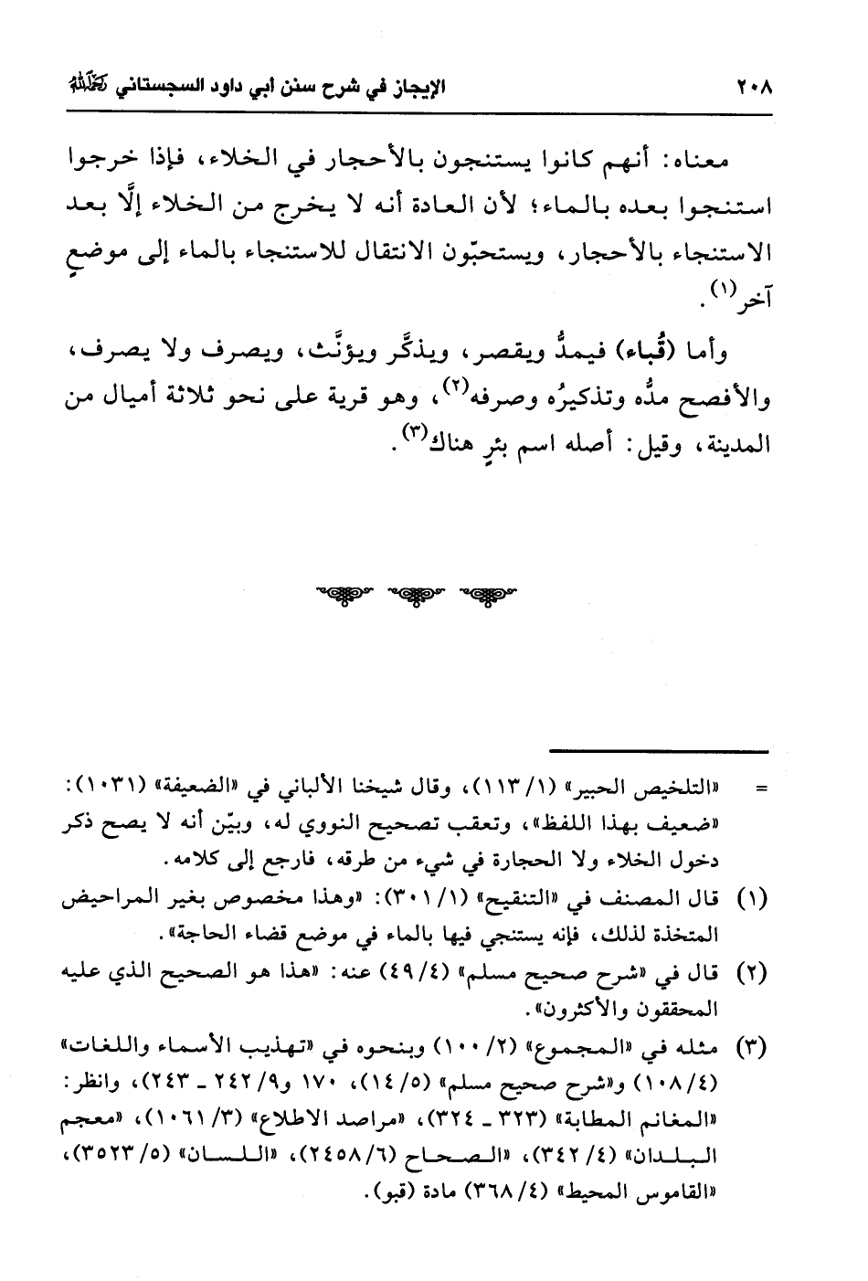(¬1) قال المصنف في "التنقيح" (1/ 301): "وهذا مخصوص بغير المراحيض المتخذة لذلك، فإنه يستنجي فيها بالماء في موضع قضاء الحاجة".
