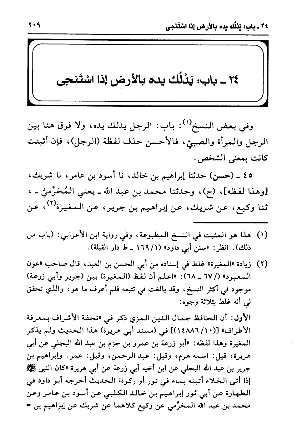 (¬2) زيادة "المغيرة" غلط في إسناده من أبي الحسن بن العبد، قال صاحب "عون المعبود" (/ 67 - 68): "اعلم أن لفظ (المغيرة) بين (جرير وأبي زرعة) موجود في أكثر النسخ، وقد بالغت في تتبعه فلم أعرف ما هو، والذي تحقق لي أنه غلط بثلاثة وجوه: