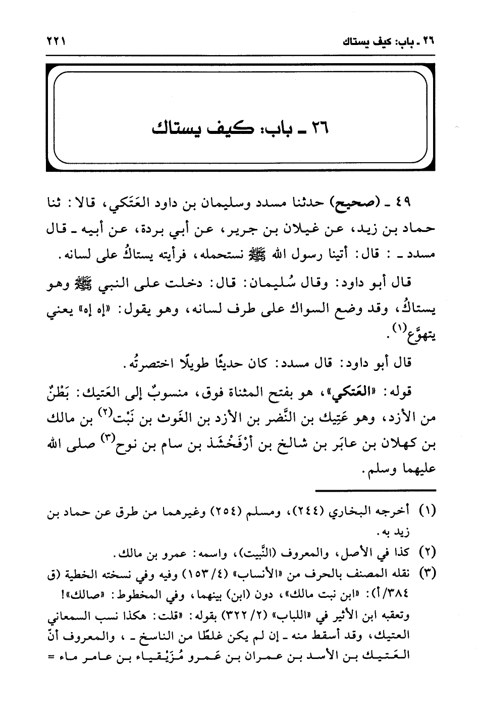 49 - (صحيح) حدثنا مسدد وسليمان بن داود العَتَكي، قالا: ثنا حماد بن زيد، عن غيلان بن جرير، عن أبي بردة، عن أبيه -قال مسدد-: قال: أتينا رسول الله - صلى الله عليه وسلم - نستحمله، فرأيته يستاكُ على لسانه.