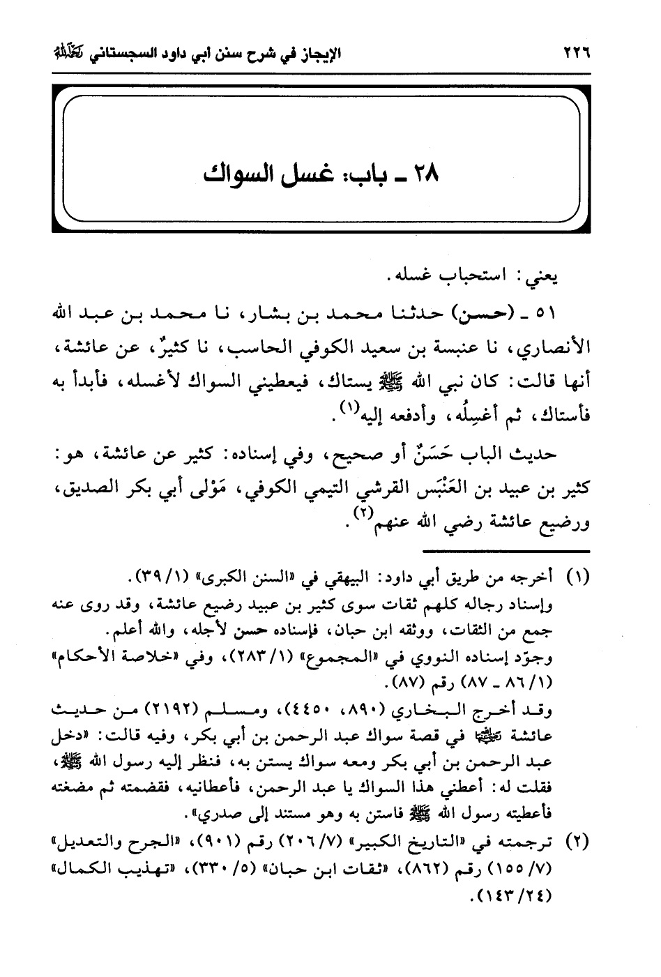 51 - (حسن) حدثنا محمد بن بشار، نا محمد بن عبد الله الأنصاري، نا عنبسة بن سعيد الكوفي الحايسب، نا كثيرٌ، عن عائشة، أنها قالت: كان نبي الله - صلى الله عليه وسلم - يستاك، فيعطيني السواك لأغسله، فأبدأ به فأستاك، ثم أغسِلُه، وأدفعه إليه (¬1).