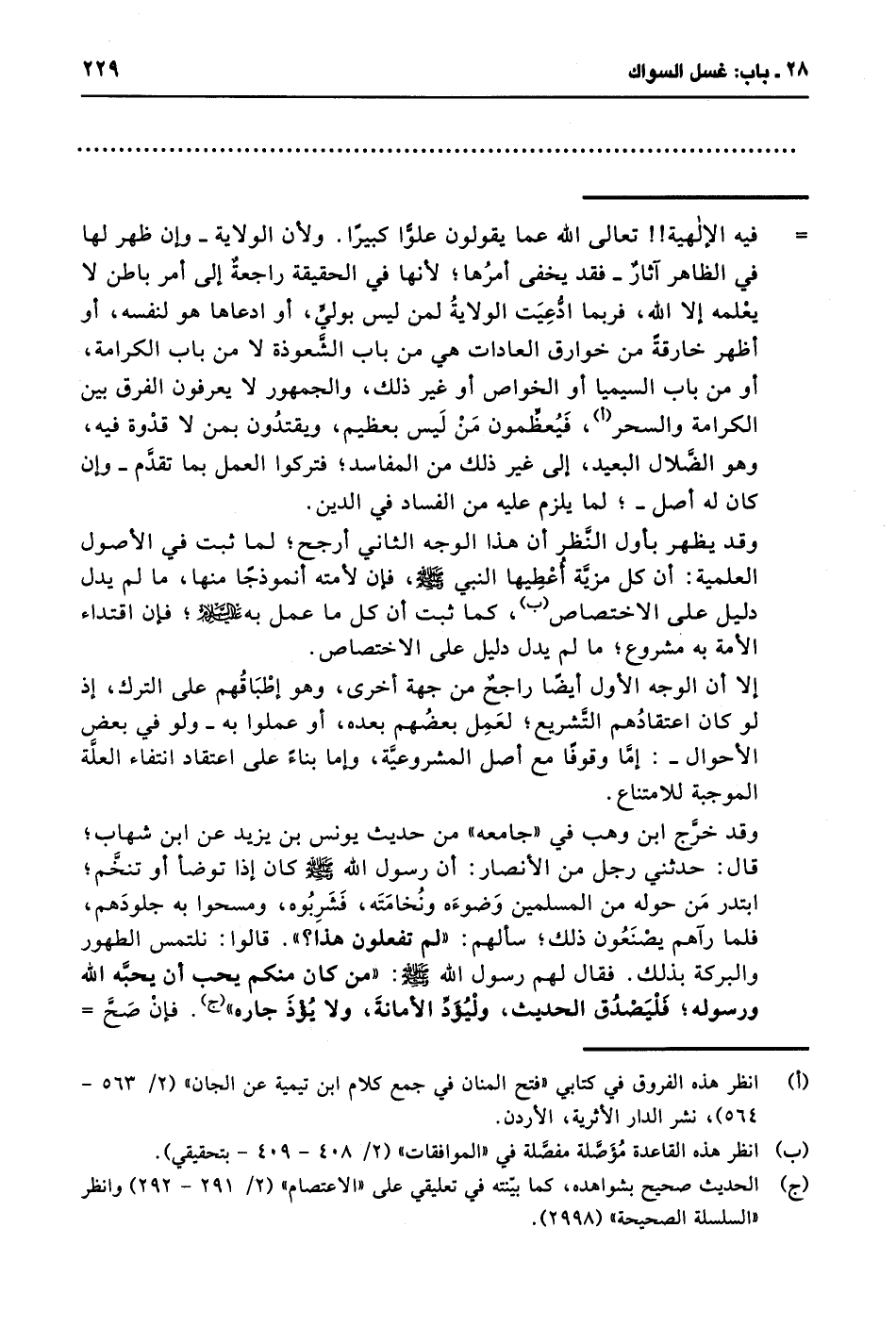 = فيه الإلهية!! تعالى الله عما يقولون علوًّا كبيرًا. ولأن الولاية -وإن ظهر لها في الظاهر آثارٌ- فقد يخفى أمرُها؛ لأنها في الحقيقة راجعةٌ إلى أمر باطن لا يعْلمه إلا الله، فربما ادُّعِيَت الولايةُ لمن ليس بوليٍّ، أو ادعاها هو لنفسه، أو أظهر خارقةً من خوارق العادات هي من باب الشعوذة لا من باب الكرامة، أو من باب السيميا أو الخواص أو غير ذلك، والجمهور لا يعرفون الفرق بين الكرامة والسحر (أ)، فَيُعظِّمون مَنْ لَيس بعظيم، ويقتدُون بمن لا قدْوة فيه، وهو الضلال البعيد، إلى غير ذلك من المفاسدة فتركوا العمل بما تقدَّم -وإن كان له أصل-؛ لما يلزم عليه من الفساد في الدين.