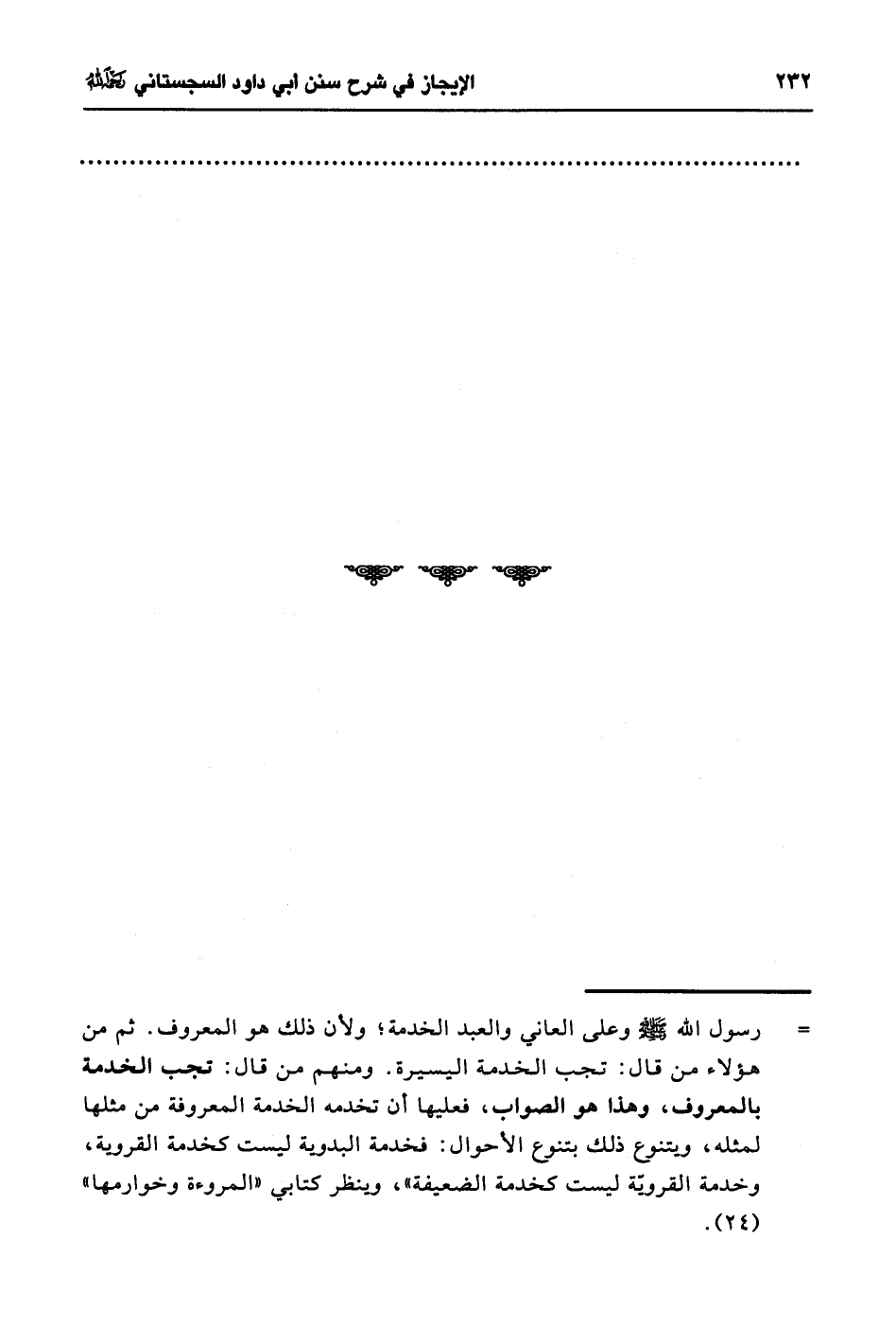 = رسول الله - صلى الله عليه وسلم - وعلى العاني والعبد الخدمة؛ ولأن ذلك هو المعروف. ثم من هؤلاء من قال: تجب الخدمة اليسيرة. ومنهم من قال: تجب الخدمة بالمعروف، وهذا هو الصواب، فعليها أن تخدمه الخدمة المعروفة من مثلها لمثله، ويتنوع ذلك بتنوع الأحوال: فخدمة البدوية ليست كخدمة القروية، وخدمة القروية ليست كخدمة الضعيفة"، وينظر كتابي "المروءة وخوارمها" (24).