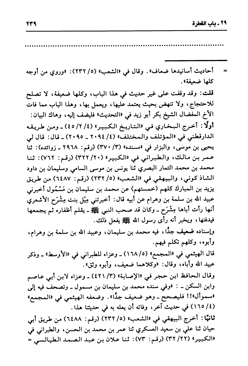 قلت: وقد وقفت على غير حديث في هذا الباب، وكلها ضعيفة، لا تصلح للاحتجاج، ولا تنهض بحيث يعتمد عليها، ويعمل بها، وهذا الباب مما فات الأخ المفضال الشيخ أبو بكر أبو زيد في "التحديث" فليضف إليه، وهاك البيان: