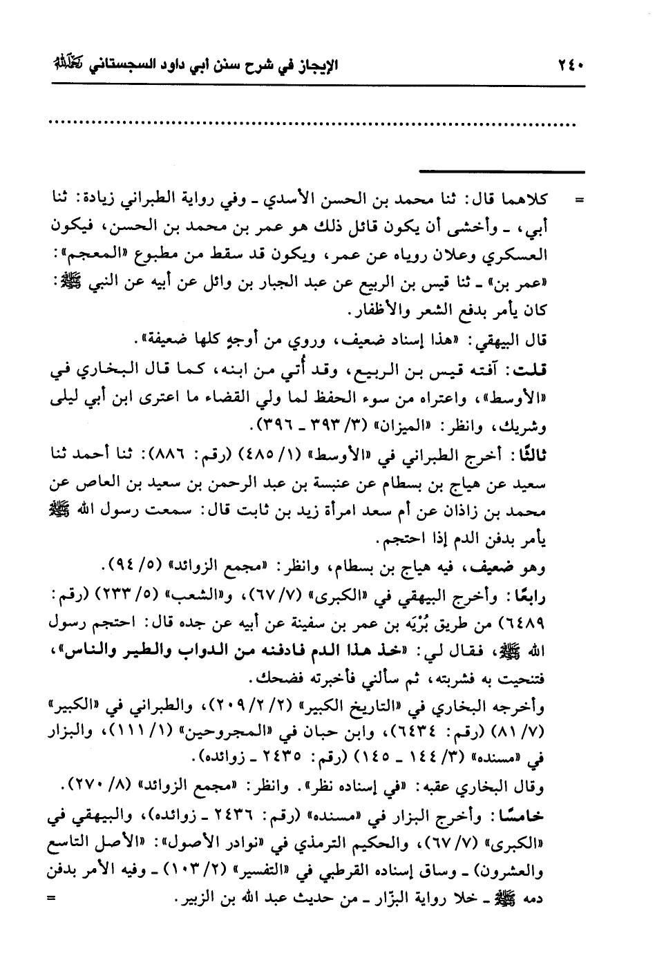 خامسًا: وأخرج البزار في "مسنده" (رقم: 2436 - زوائده)، والبيهقي في "الكبرى" (7/ 67)، والحكيم الترمذي في "نوادر الأصول": "الأصل التاسع والعشرون) -وساق إسناده القرطبي في "التفسير" (2/ 103) - وفيه الأمر بدفن دمه - صلى الله عليه وسلم -خلا رواية البزار- من حديث أبو عبد الله بن الزبير. =