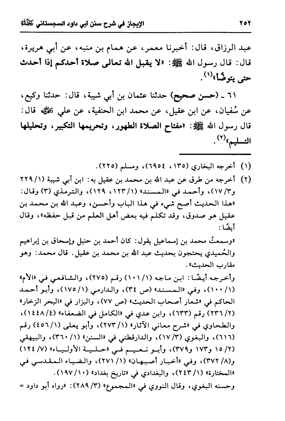 61 - (حسن صحيح) حدثنا عثمان بن أبي شيبة، قال: حدثنا وكيع، عن سُفيان، عن ابن عقيل، عن محمد ابن الحنفية، عن علي -رضي الله عنه - قال: قال رسول الله - صلى الله عليه وسلم -: "مفتاح الصلاة الطهور، وتحريمها التكبير، وتحليلها التسليم" (¬2).