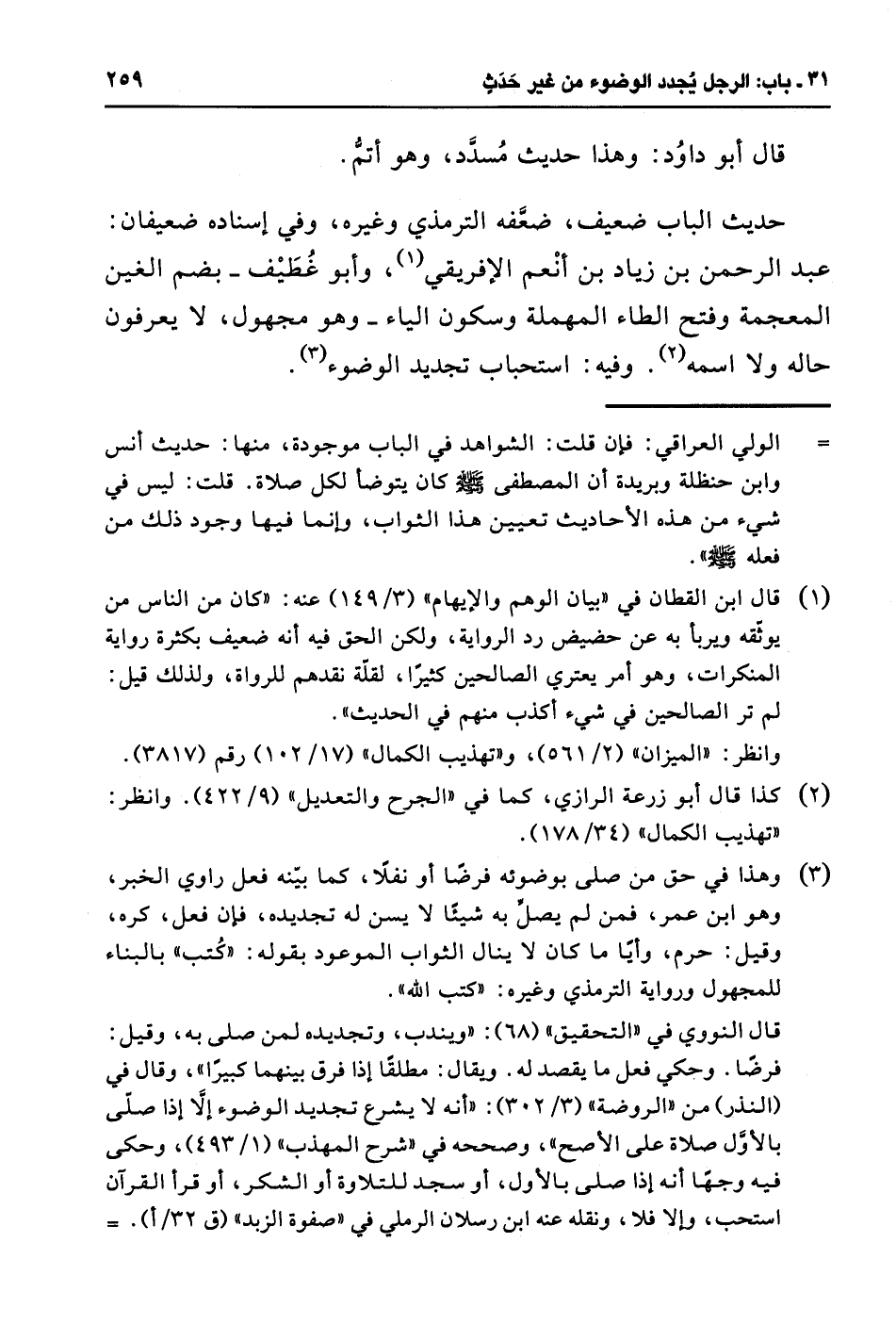 = الولي العراقي: فإن قلت: الشواهد في الباب موجودة، منها: حديث أنس وابن حنظلة وبريدة أن المصطفى - صلى الله عليه وسلم - كان يتوضأ لكل صلاة. قلت: ليس في شيء من هذه الأحاديث تعيين هذا الثواب، وإنما فيها وجود ذلك من فعله - صلى الله عليه وسلم -".