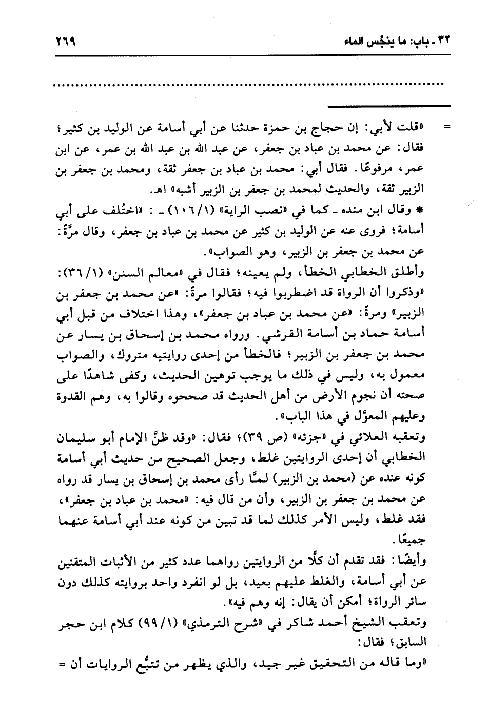 "وذكروا أن الرواة قد اضطربوا فيه؛ فقالوا مرةً: "عن محمد بن جعفر بن الزبير" ومرةً: "عن محمد بن عباد بن جعفر"، وهذا اختلاف من قبل أبي أسامة حماد بن أسامة القرشي. ورواه محمد بن إسحاق بن يسار عن محمد بن جعفر بن الزبيرة فالخطأ من إحدى روايتيه متروك، والصواب معمول به، وليس في ذلك ما يوجب توهين الحديث، وكفى شاهدًا على صحته أن نجوم الأرض من أهل الحديث قد صححوه وقالوا به، وهم القدوة وعليهم المعوَّل في هذا الباب".