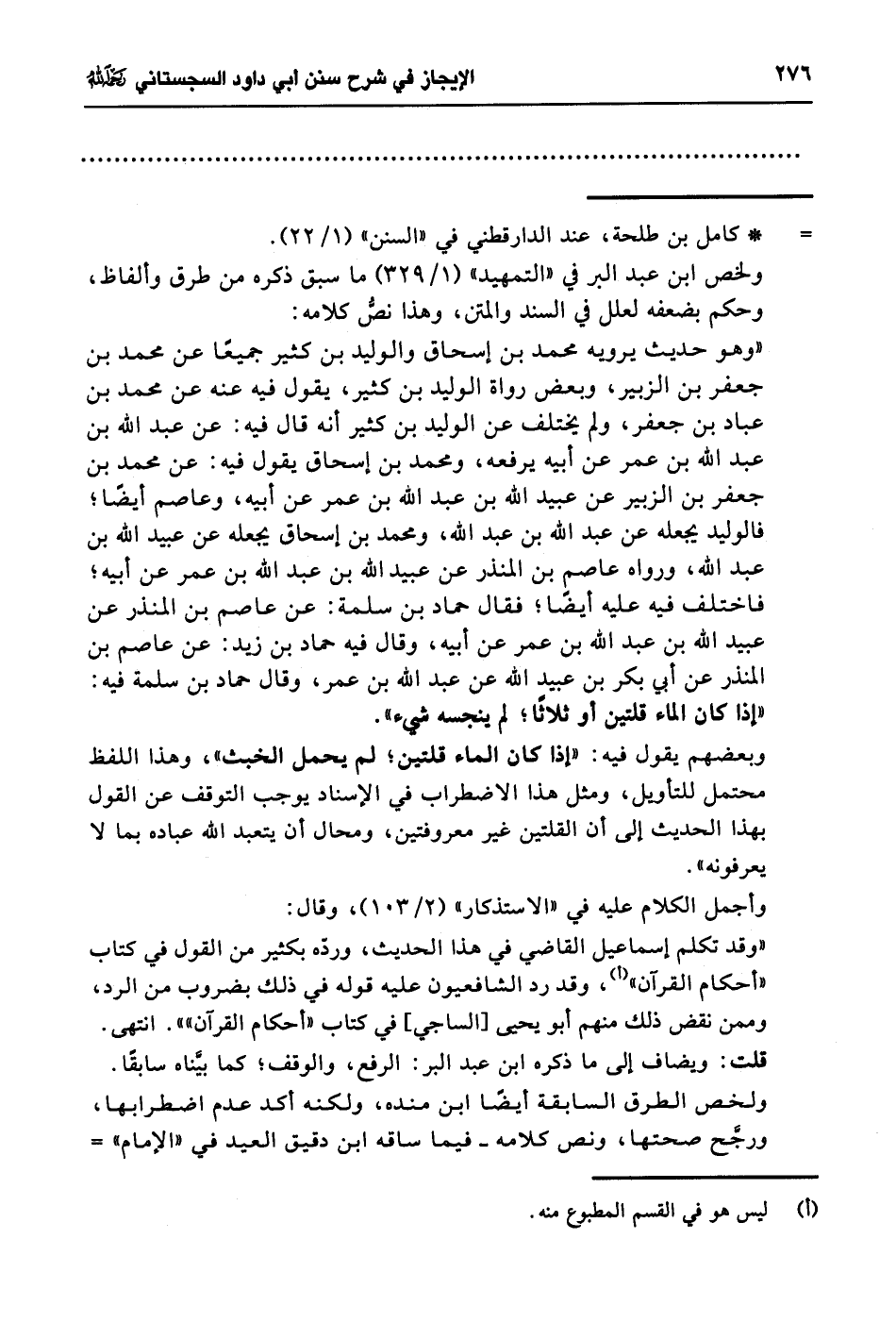 "وهو حديث يرويه محمد بن إسحاق والوليد بن كثير جميعًا عن محمد بن جعفر بن الزبير، وبعض رواة الوليد بن كثير، يقول فيه عنه عن محمد بن عباد بن جعفر، ولم يختلف عن الوليد بن كثير أنه قال فيه: عن عبد الله بن عبد الله بن عمر عن أبيه يرفعه، ومحمد بن إسحاق يقول فيه: عن محمد بن جعفر بن الزبير عن عبيد الله بن عبد الله بن عمر عن أبيه، وعاصم أيضًا؛ فالوليد يجعله عن عبد الله بن عبد الله، ومحمد بن إسحاق يجعله عن عبيد الله بن عبد الله، ورواه عاصم بن المنذر عن عبيد الله بن عبد الله بن عمر عن أبيه؛ فاختلف فيه عليه أيضًا؛ فقال حماد بن سلمة: عن عاصم بن المنذر عن عبيد الله بن عبد الله بن عمر عن أبيه، وقال فيه حماد بن زيد: عن عاصم بن المنذر عن أبي بكر بن عبيد الله عن عبد الله بن عمر، وقال حماد بن سلمة فيه: "إذا كان الماء قلتين أو ثلاثًا؛ لم ينجسه شيء".