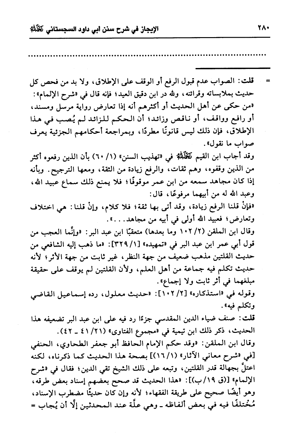 وقد أجاب ابن القيام - صلى الله عليه وسلم - في "تهذيب السنن" (1/ 60) بأن الذين رفعوه أكثر من الدين وقفوه، وهم ثقات، والرفع زيادة من الثقة، ومعها الترجيح. وبأنه إذا كان مجاهد سمعه من ابن عمر موقوفاً؛ فلا يمنع ذلك سماع عبيد الله، وعبد الله له من أبيهما مرفوعًا، قال: