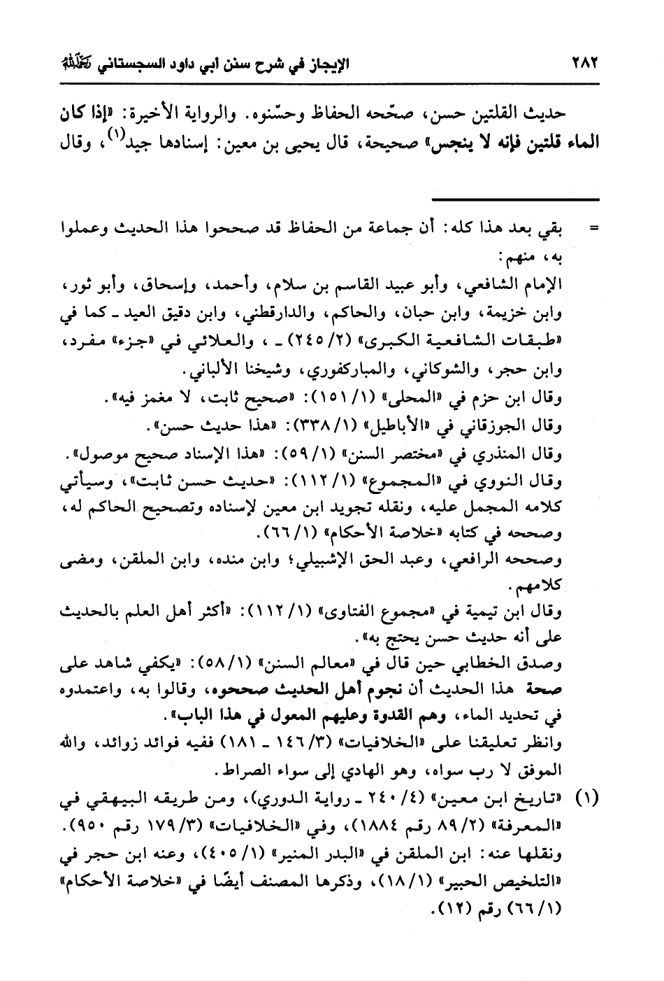 حديث القلتين حسن، صحّحه الحفاظ وحسّنوه. والرواية الأخيرة: "إذا كان قلتين فإنه لا ينجس" صحيحة، قال يحيى بن معين: إسنادها جيد (¬1)، وقال