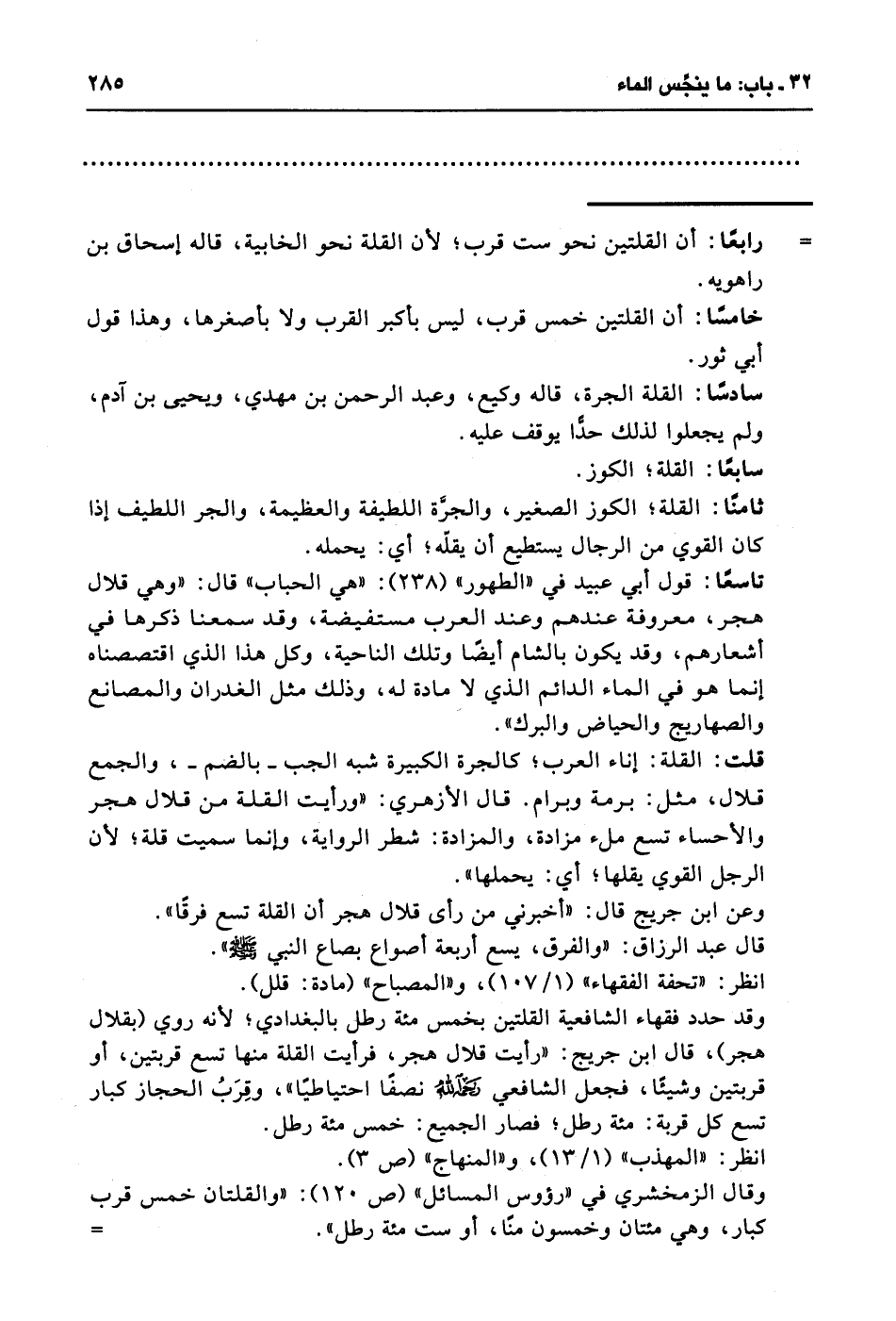 = رابعًا: أن القلتين نحو ست قرب؛ لأن القلة نحو الخابية، قاله أبو إسحاق بن راهويه.