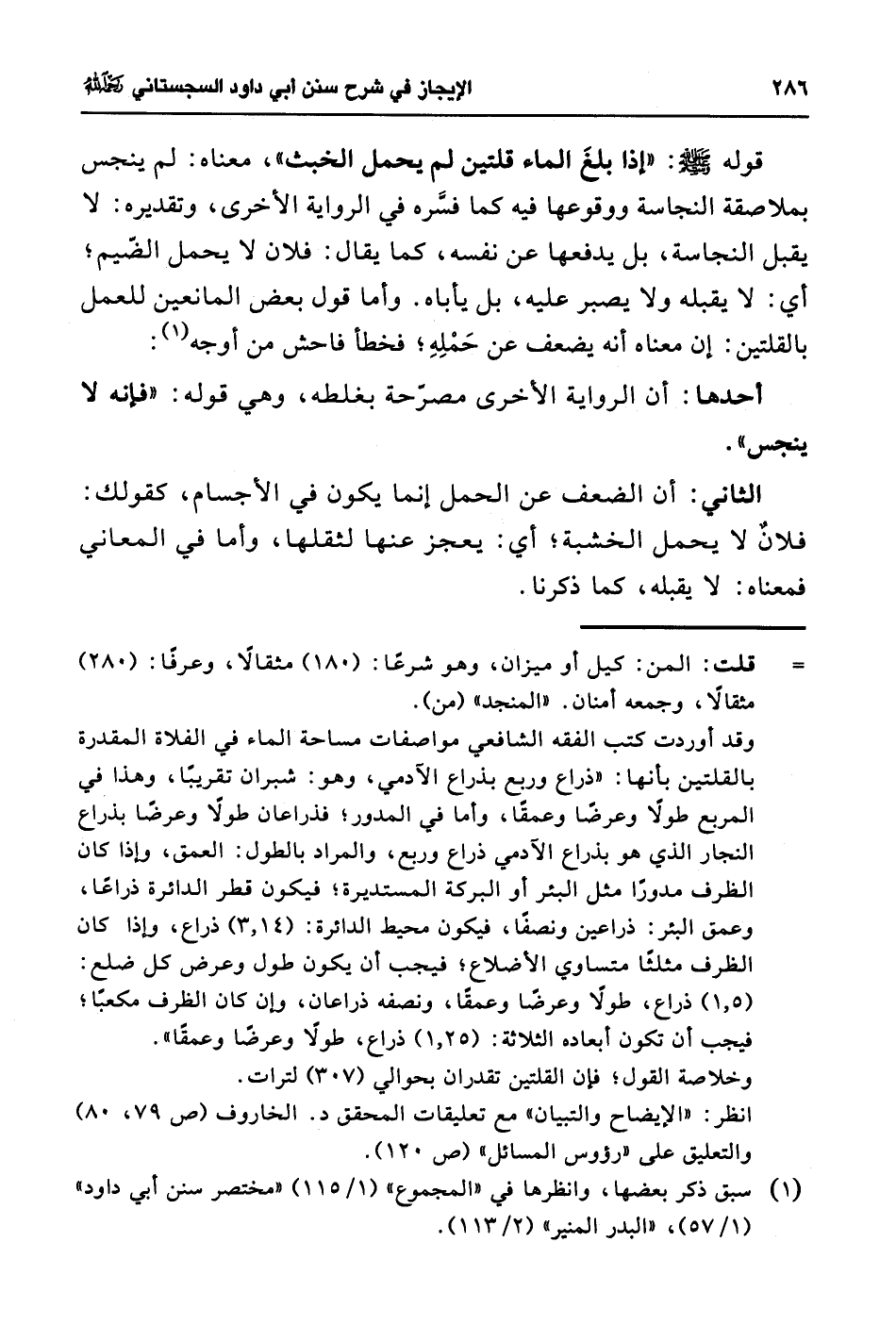 وقد أوردت كتب الفقه الشافعي مواصفات مساحة الماء في الفلاة المقدرة بالقلتين بأنها: "ذراع وربع بذراع الآدمي، وهو: شبران تقريبًا، وهذا في المربع طولاً وعرضًا وعمقًا، وأما في المدور؛ فذراعان طولاً وعرضًا بذراع النجار الذي هو بذراع الآدمي ذراع وربع، والمراد بالطول: العمق، وإذا كان الظرف مدورًا مثل البئر أو البركة المستديرة؛ فيكون قطر الدائرة ذراعًا، وعمق البئر: ذراعين ونصفًا، فيكون محيط الدائرة: (3,14) ذراع، وإذا كان الظرف مثلثًا متساوي الأضلاع؛ فيجب أن يكون طول وعرض كل ضلع: (1,5) ذراع، طولاً وعرضًا وعمقًا، ونصفه ذراعان، وإن كان الظرف مكعبًا؛ فيجب أن تكون أبعاده الثلاثة: (1,25) ذراع، طولاً وعرضًا وعمقًا".