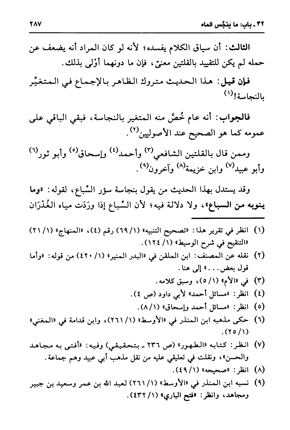 وممن قال بالقلتين الشافعي (¬3) وأحمد (¬4) وإسحاق (¬5) وأبو ثور (¬6) وأبو عبيد (¬7) وابن خزيمة (¬8) وآخرون (¬9).