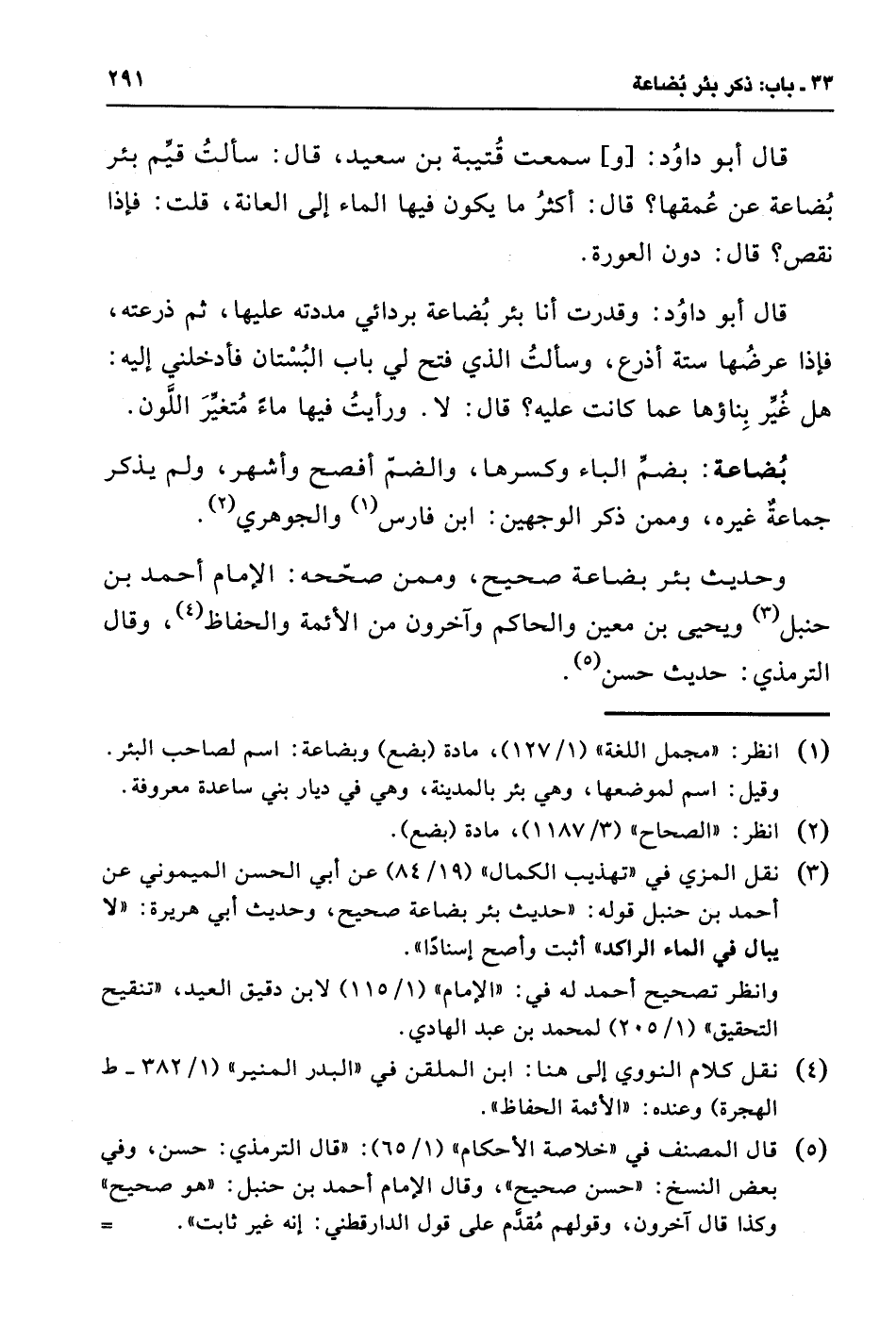 (¬3) نقل المزي في "تهذيب الكمال" (19/ 84) عن أبي الحسن الميموني عن أحمد بن حنبل قوله: "حديث بئر بضاعة صحيح، وحديث أبي هريرة: "لا يبال في الماء الراكد" أثبت وأصح إسنادًا".