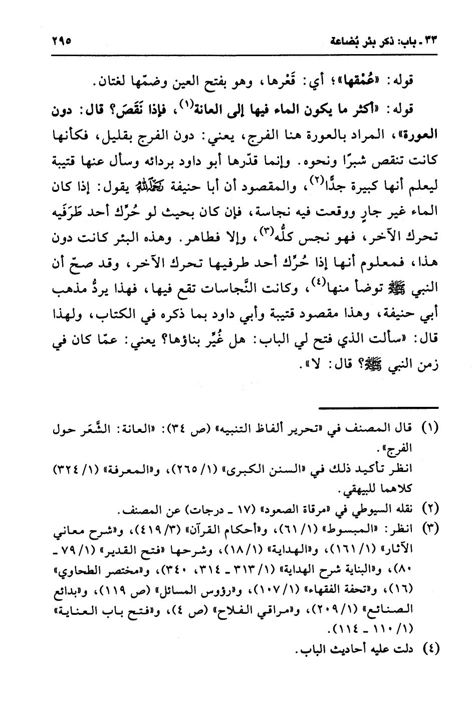 قوله: "أكثر ما يكون الماء فيها إلى العانة (¬1)، فإذا نَقَصَ؟ قال: دون العورة"، المراد بالعورة هنا الفرج، يعني: دون الفرج بقليل، فكأنها كانت تنقص شبرًا ونحوه. وإنما قدرها أبو داود بردائه وسأل عنها قتيبة ليعلم أنها كبيرة جدًّا (¬2)، والمقصود أن أبا حنيفة رحمه الله يقول: إذا كان الماء غير جارٍ ووقعت فيه نجاسة، فإن كان بحيث لو حُرِّك أحد طَرَفَيه تحرك الآخر، فهو نجس كله (¬3)، وإلا فطاهر. وهذه البئر كانت دون هذا، فمعلوم أنها إذا حُرِّك أحد طرفيها تحرك الآخر، وقد صح أن النبي - صلى الله عليه وسلم - توضأ منها (¬4)، وكانت النَّجاسات تقع فيها، فهذا يرد مذهب أبي حنيفة، وهذا مقصود قتيبة وأبي داود بما ذكره في الكتاب، ولهذا قال: "سألت الذي فتح لي الباب: هل غُير بناؤها؟ يعني: عمّا كان في زمن النبي - صلى الله عليه وسلم -؟ قال: لا".