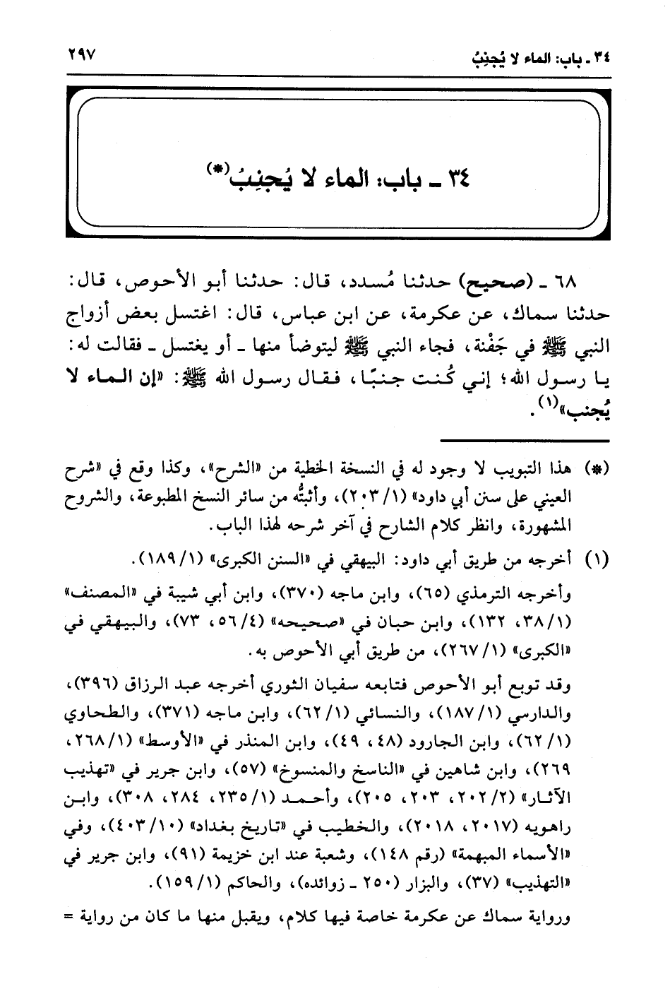 68 - (صحيح) حدثنا مُسدد، قال: حدثنا أبو الأحوص، قال: حدثنا سماك، عن عكرمة، عن ابن عباس، قال: اغتسل بعض أزواج النبي - صلى الله عليه وسلم - جَفْنة، فجاء النبي - صلى الله عليه وسلم - ليتوضأ منها -أو يغتسل- فقالت له: يا رسول الله؛ إني كُنت جنبًا، فقال رسول الله - صلى الله عليه وسلم -: "إن الماء لا يُجنب" (¬1).