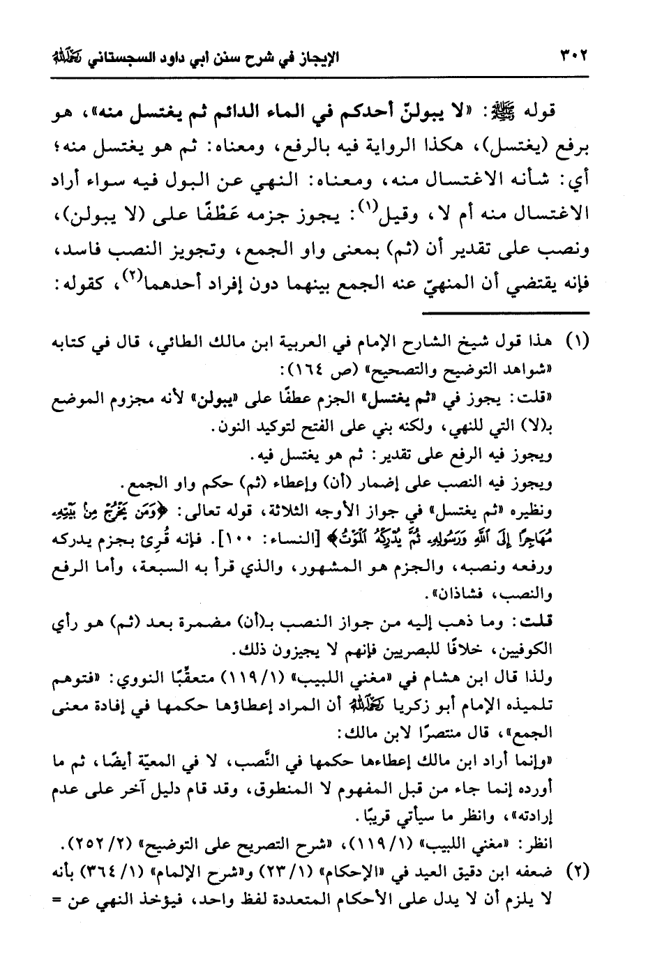 قوله - صلى الله عليه وسلم -: "لا يبولنّ أحدكم في الماء الدائم ثم يغتسل منه"، هو برفع (يغتسل)، هكذا الرواية فيه بالرفع، ومعناه: ثم هو يغتسل منه؛ أي: شأنه الاغتسال منه، ومعناه: النهي عن البول فيه سواء أراد الاغتسال منه أم لا، وقيل (¬1): يجوز جزمه عَطْفًا على (لا يبولن)، ونصب على تقدير أن (ثم) بمعنى واو الجمع، وتجويز النصب فاسد، فإنه يقتضي أن المنهي عنه الجمع بينهما دون إفراد أحدهما (¬2)، كقوله: