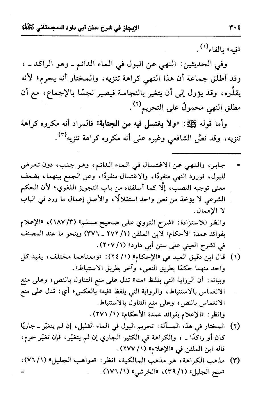 (¬2) المختار في هذه المسألة: تحريم البول في الماء القليل، إن لم يتغيّر -جاريًا كان أو راكدًا-، والكراهة في الكثير الجاري إن لم يتغيّر، فإن تغير حرم، قاله ابن الملقن في "الإعلام" (1/ 277).