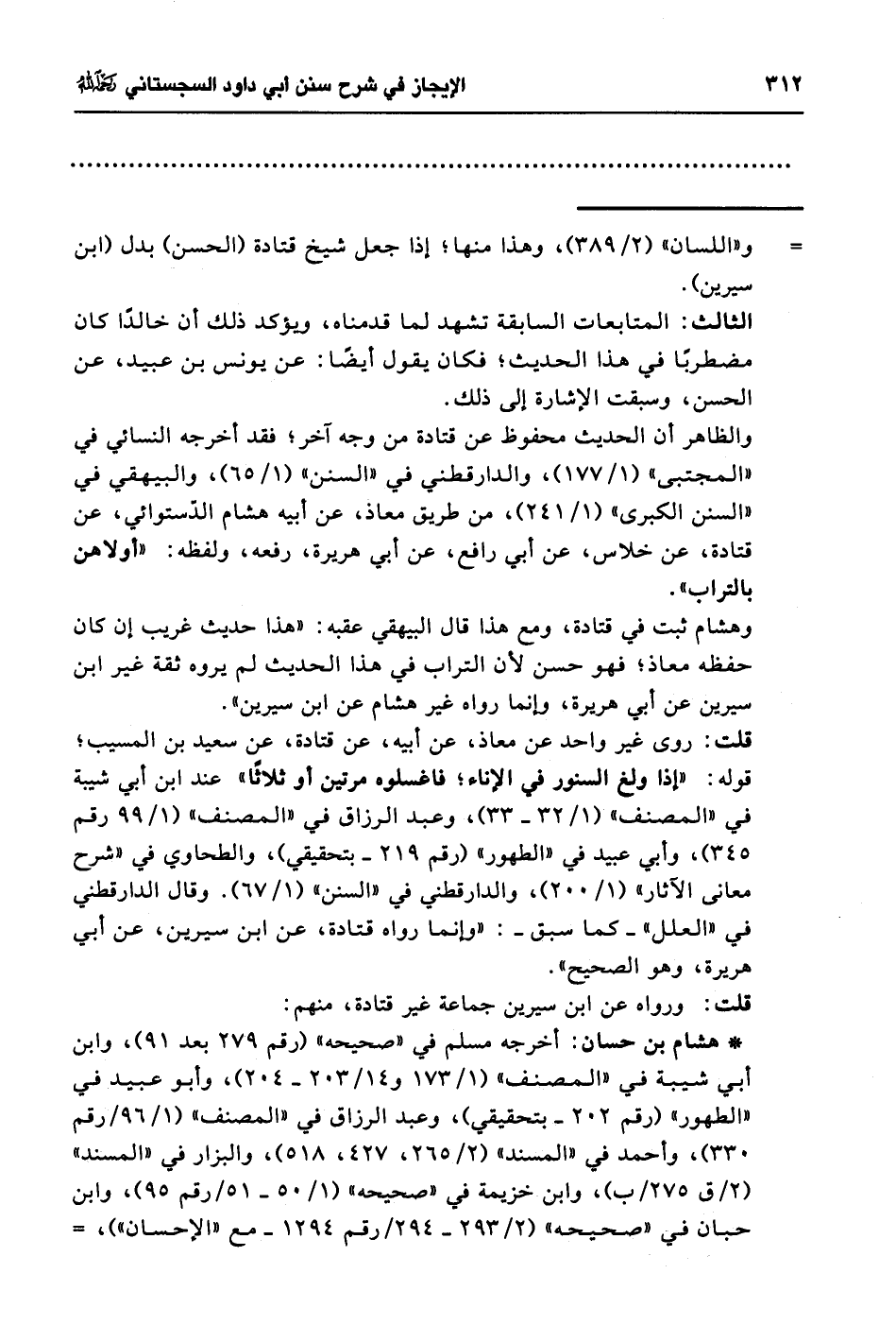 "هشام بن حسان: أخرجه مسلم في "صحيحه" (رقم 279 بعد 91)، وابن أبي شيبة في "المصنف" (1/ 173 و14/ 203 - 204)، وأبو عبيد في "الطهور" (رقم 202 - بتحقيقي)، وعبد الرزاق في "المصنف" (1/ 96/ رقم 330)، وأحمد في "المسند" (2/ 265، 427، 518)، والبزار في "المسند" (2/ ق 275/ ب)، وابن خزيمة في "صحيحه" (1/ 50 - 51/ رقم 95)، وابن حبان في "صحيحه" (2/ 293 - 294/ رقم 1294 - مع "الإحسان")، =