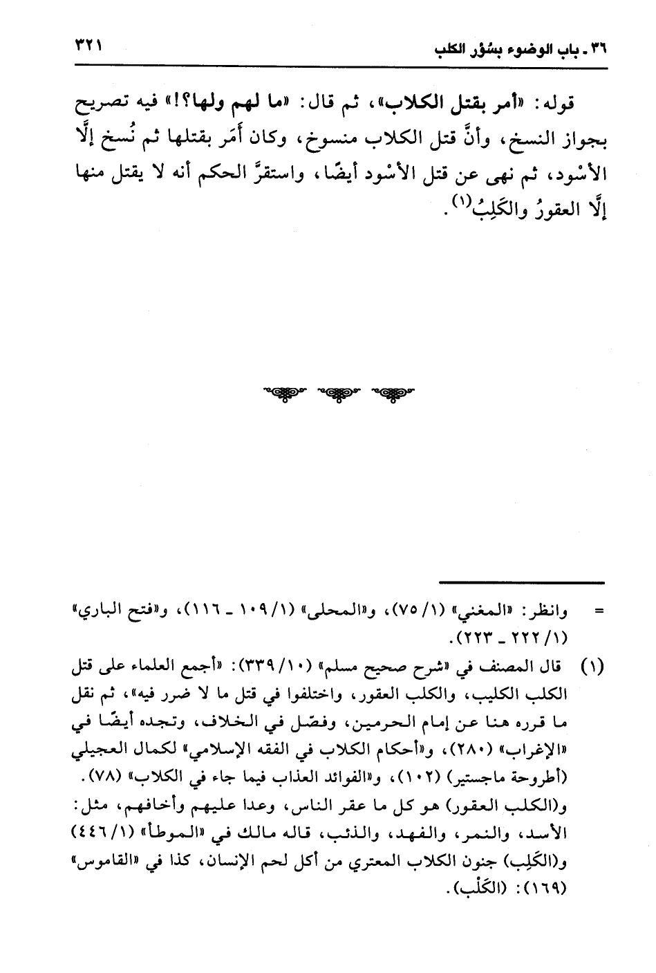 (¬1) قال المصنف في "شرح صحيح مسلم" (10/ 339): "أجمع العلماء على قتل الكلب الكليب، والكلب العقور، واختلفوا في قتل ما لا ضرر فيها"، ثم نقل ما قرره هنا عن إمام الحرمين، وفصل في الخلاف، وتجده أيضًا في "الإغراب" (280)، و"أحكام الكلاب في الفقه الإسلامي، لكمال العجيلي (أطروحة ماجستير) (102)، و"الفوائد العذاب فيما جاء في الكلاب" (78).