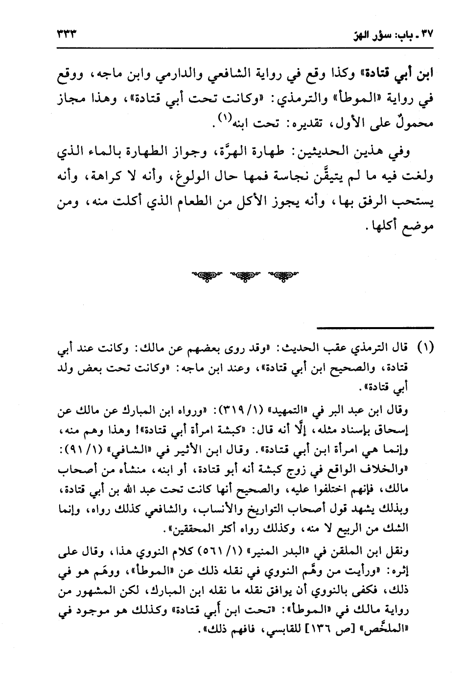 وقال ابن عبد البر في "التمهيد" (1/ 319): "ورواه ابن المبارك عن مالك عن إسحاق بإسناد مثله، إلا أنه قال: "كبشة امرأة أبي قتادة"! وهذا وهم منه، وإنما هي امرأة ابن أبي قتادة". وقال ابن الأثير في "الشافي" (1/ 91): "والخلاف الواقع في زوج كبشة أنه أبو قتادة، أو ابنه، منشأه من أصحاب مالك، فإنهم اختلفوا عليه، والصحيح أنها كانت تحت عبد الله بن أبي قتادة، وبذلك يشهد قول أصحاب التواريخ والأنساب، والشافعي كذلك رواه، وإنما الشك من الربيع لا منه، وكذلك رواه أكثر المحققين".