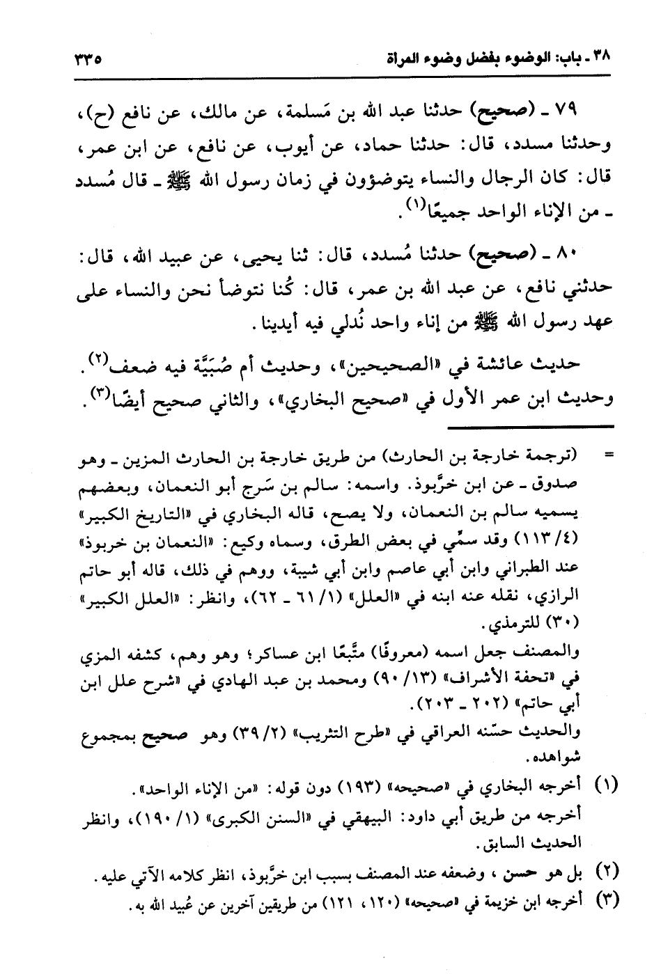 79 - (صحيح) حدثنا عبد الله بن مَسلمة، عن مالك، عن نافع (ح)، وحدثنا مسدد، قال: حدثنا حماد، عن أيوب، عن نافع، عن ابن عمر، قال: كان الرجال والنساء يتوضؤون في زمان رسول الله - صلى الله عليه وسلم - قال مُسدد - من الإناء الواحد جميعًا (¬1).