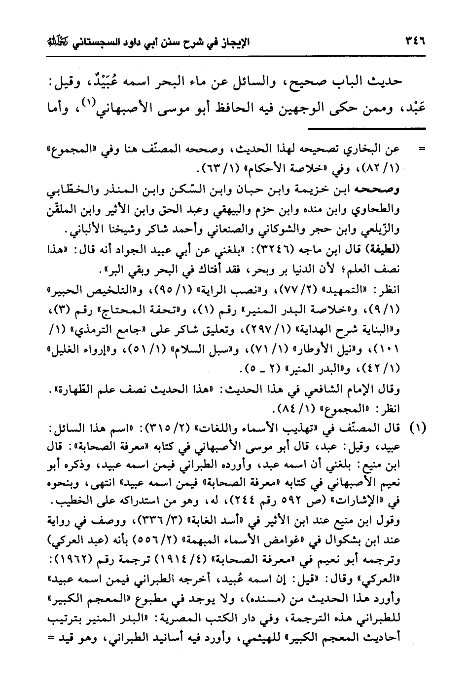حديث الباب صحيح، والسائل عن ماء البحر اسمه عُبَيْدٌ، وقيل: عبد، وممن حكى الوجهين فيه الحافظ أبو موسى الأصبهاني (¬1)، وأما