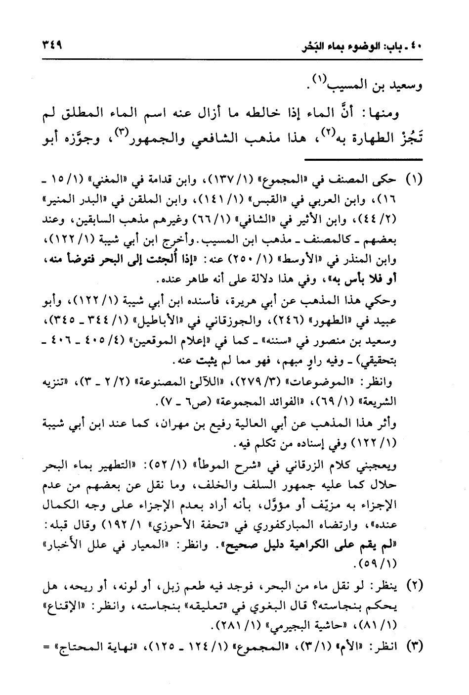 (¬1) حكى المصنف في "المجموع" (1/ 137)، وابن قدامة في "المغني" (1/ 15 - 16)، وابن العربي في "القبس" (1/ 141)، وابن الملقن في "البدر المنير" (2/ 44)، وابن الأثير في "الشافي" (1/ 66) وغيرهم مذهب السابقين، وعند بعضهم -كالمصنف- مذهب ابن المسيب. وأخرج ابن أبي شيبة (1/ 122)، وابن المنذر في "الأوسط" (1/ 250) عنه: "إذا أُلجئت إلى البحر فتوضأ منه، أو فلا بأس به"، وفي هذا دلالة على أنه طاهر عنده.