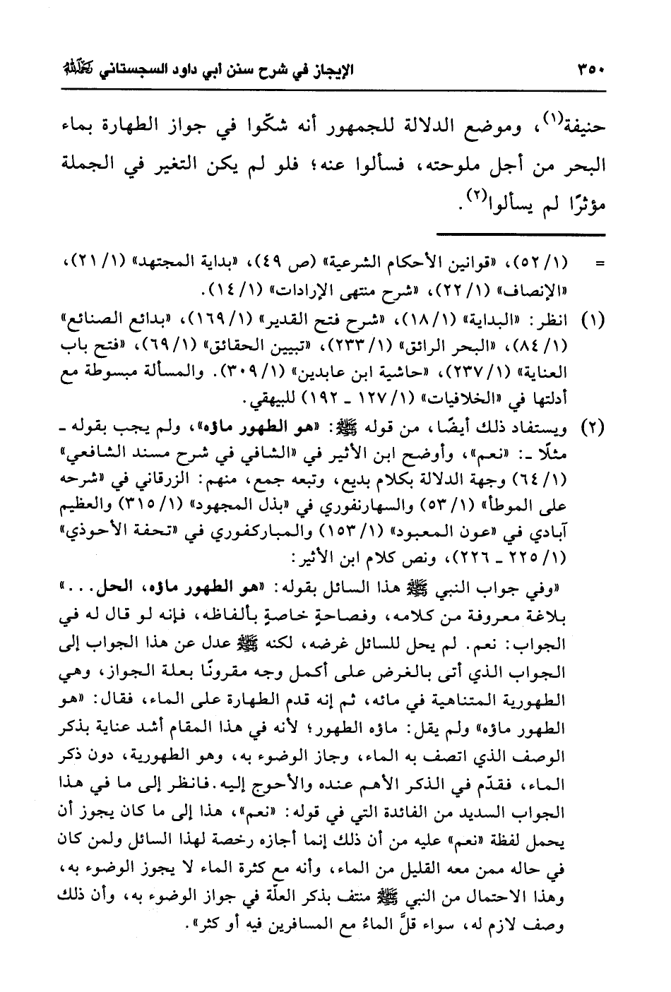 (¬2) ويستفاد ذلك أيضًا، من قوله - صلى الله عليه وسلم -: "هو الطهور ماؤه"، ولم يجب بقوله - مثلاً-: "نعم"، وأوضح ابن الأثير في "الشافي في شرح مسند الشافعي" (1/ 64) وجهة الدلالة بكلام بديع، وتبعه جمع، منهم: الزرقاني في "شرحه على الموطأ" (1/ 53) والسهارنفوري في "بذل المجهود" (1/ 315) والعظيم آبادي في "عون المعبود" (1/ 153) والمباركفوري في "تحفة الأحوذي" (1/ 225 - 226)، ونص كلام ابن الأثير: