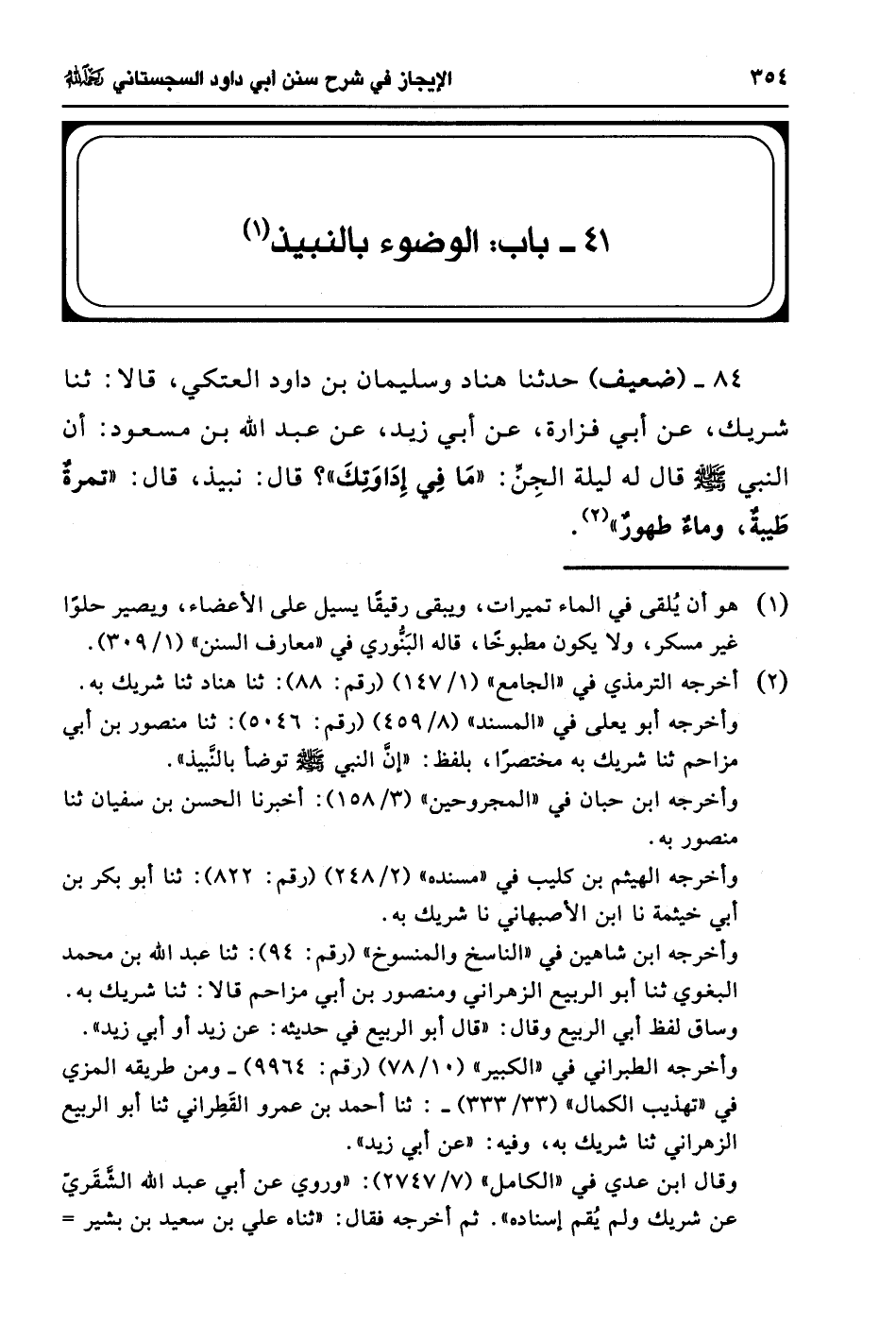 84 - (ضعيف) حدثنا هناد وسليمان بن داود العتكي، قالا: ثنا شريك، عن أبي فزارة، عن أبي زيد، عن عبد الله بن مسعود: أن النبي - صلى الله عليه وسلم - قال له ليلة الجِنِّ: "ما فِي إِدَاوَتكَ"؟ قال: نبيذ، قال: "تمرةٌ طَيبة، وماءٌ طهور" (¬2).