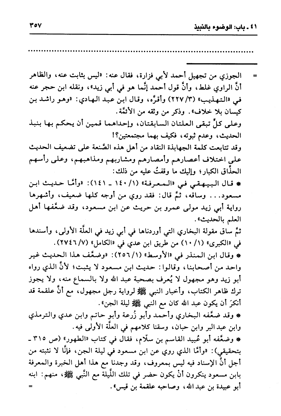* وقال ابن المنذر في "الأوسط" (1/ 256): "وضعف هذا الحديث غير واحد من أصحابنا، وقالوا: حديث ابن مسعود لا يثبت؛ لأن الذي رواه أبو زيد وهو مجهول لا يُعرف بصحبة عبد الله ولا بالسماع منه، ولا يجوز ترك ظاهر الكتاب، وأخبار النبي - صلى الله عليه وسلم - لرواية رجل مجهول، مع أن علقمة قد أنكرَ أن يكون عبد الله كان مع النبي - صلى الله عليه وسلم - ليلة الجن".