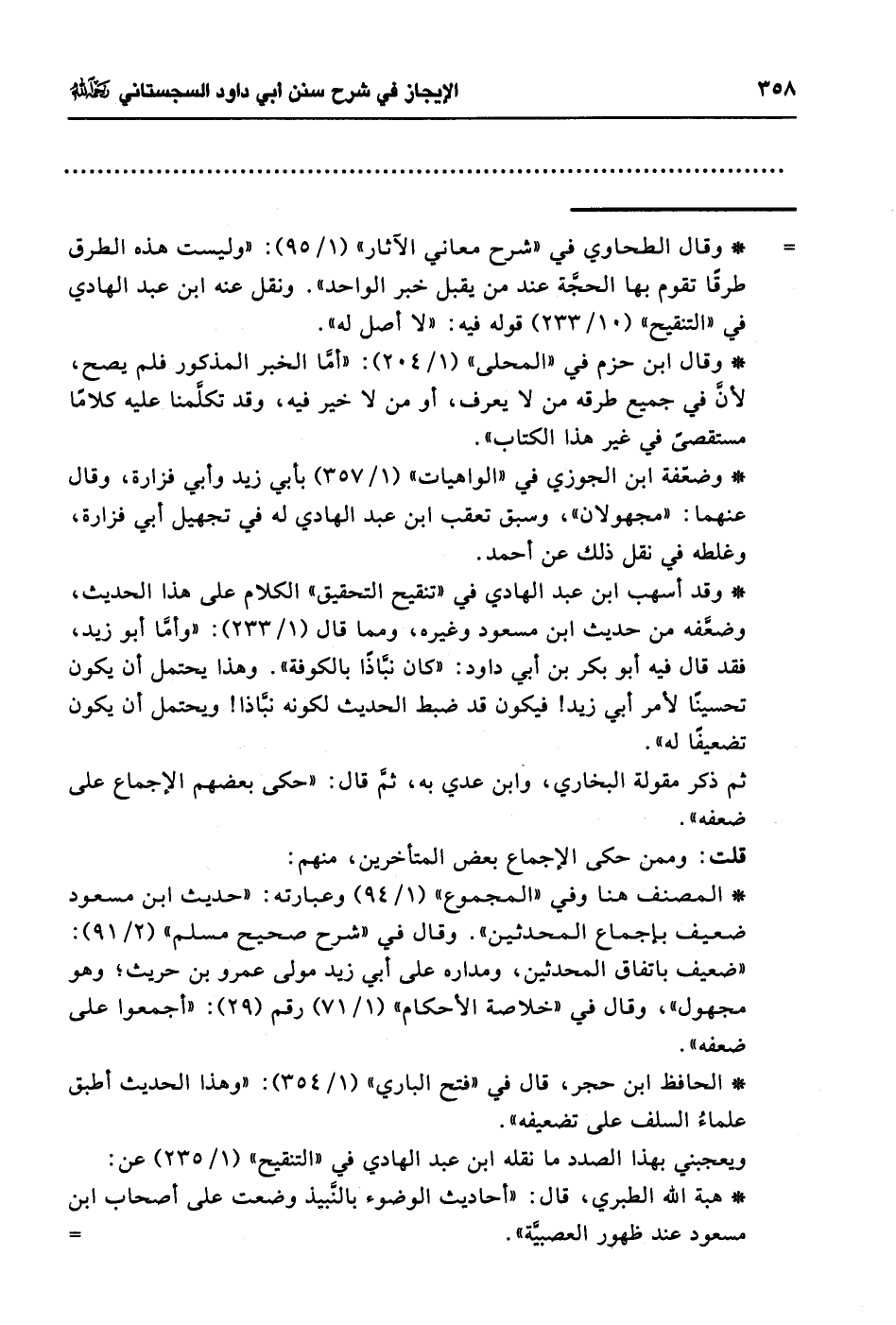 * وقد أسهب ابن عبد الهادي في "تنقيح التحقيق" الكلام على هذا الحديث، وضعفه من حديث ابن مسعود وغيره، ومما قال (1/ 233): "وأمَّا أبو زيد، فقد قال فيه أبو بكر بن أبي داود: "كان نبَّاذًا بالكوفة". وهذا يحتمل أن يكون تحسينًا لأمر أبي زيد! فيكون قد ضبط الحديث لكونه نبَّاذا! ويحتمل أن يكون تضعيفًا له".