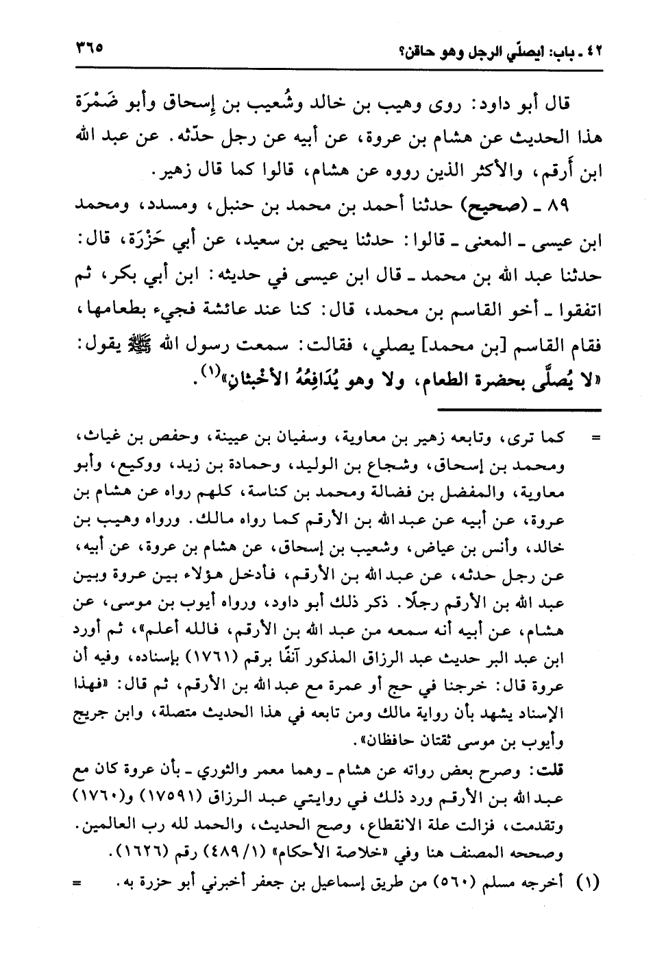 89 - (صحيح) حدثنا أحمد بن محمد بن حنبل، ومسدد، ومحمد ابن عيسى -المعنى- قالوا: حدثنا يحيى بن سعيد، عن أبي حَزْرَة، قال: حدثنا عبد الله بن محمد -قال ابن عيسى في حديثه: ابن أبي بكر، ثم اتفقوا- أخو القاسم بن محمد، قال: كنا عند عائشة فجيء بطعامها، فقام القاسم [بن محمد] يصلي، فقالت: سمعت رسول الله - صلى الله عليه وسلم - يقول: "لا يُصلَّى بحضرة الطعام، ولا وهو يُدَافِعُهُ الأخْبثان" (¬1).