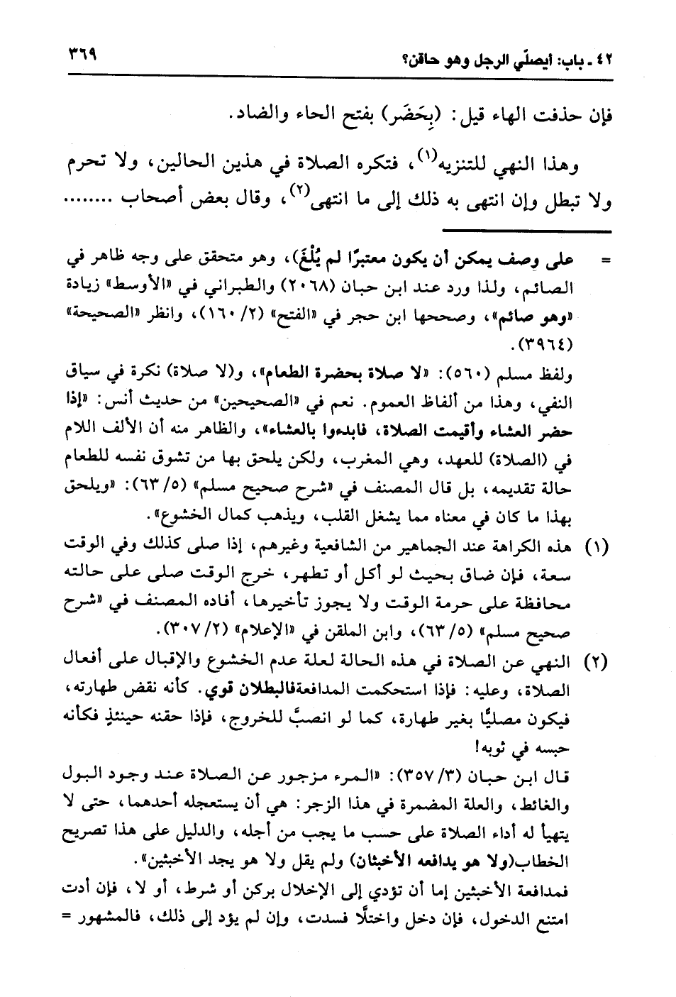 وهذا النهي للتنزيه (¬1)، فتكره الصلاة في هذين الحالين، ولا تحرم تبطل وإن انتهى به ذلك إلى ما انتهى (¬2)، وقال بعض أصحاب ........