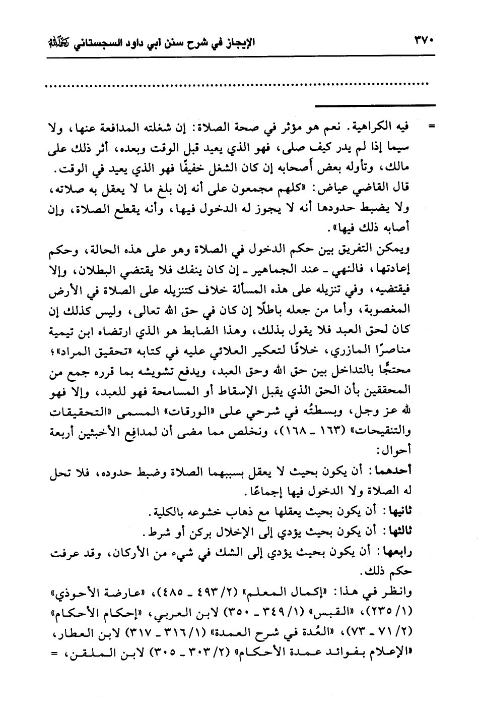ويمكن التفريق بين حكم الدخول في الصلاة وهو على هذه الحالة، وحكم إعادتها، فالنهي -عند الجماهير- إن كان ينفك فلا يقتضي البطلان، وإلا فيقتضيه، وفي تنزيله على هذه المسألة خلاف كتنزيله على الصلاة في الأرض المغصوبة، وأما من جعله باطلاً إن كان في حق الله تعالى، وليس كذلك إن كان لحق العبد فلا يقول بذلك، وهذا الضابط هو الذي ارتضاه ابن تيمية مناصرًا المازري، خلافًا لتعكير العلائي عليه في كتابه "تحقيق المراد"؛ محتجًّا بالتداخل بين حق الله وحق العبد، ويدفع تشويشه بما قرره جمع من المحققين بأن الحق الذي يقبل الإسقاط أو المسامحة فهو للعبد، وإلا فهو لله عز وجل، وبسطتُه في شرحي على "الورقات" المسمى "التحقيقات والتنقيحات" (163 - 168)، ونخلص مما مضى أن لمدافِع الأخبثين أربعة أحوال: