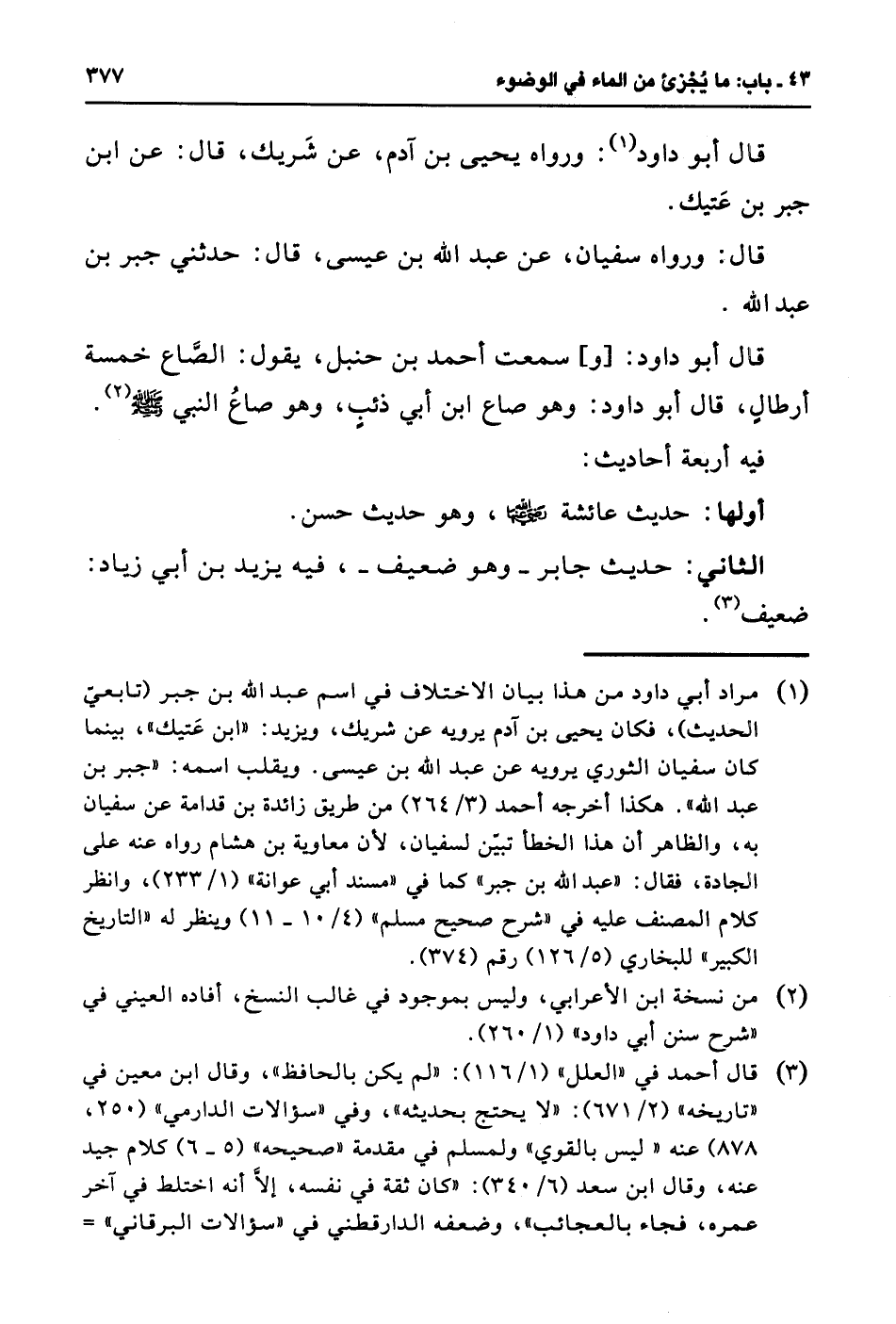 (¬1) مراد أبي داود من هذا بيان الاختلاف في اسم عبد الله بن جبر (تابعي الحديث)، فكان يحيى بن آدم يرويه عن شريك، ويزيد: "ابن عَتيك"، بينما كان سفيان الثوري يرويه عن عبد الله بن عيسى. ويقلب اسمه: "جبر بن عبد الله". هكذا أخرجه أحمد (3/ 264) من طريق زائدة بن قدامة عن سفيان به، والظاهر أن هذا الخطأ تبيّن لسفيان، لأن معاوية بن هشام رواه عنه على الجادة، فقال: "عبد الله بن جبر" كما في "مسند أبي عوانة" (1/ 233)، وانظر كلام المصنف عليه في "شرح صحيح مسلم" (4/ 10 - 11) وينظر له "التاريخ الكبير" للبخاري (5/ 126) رقم (374).