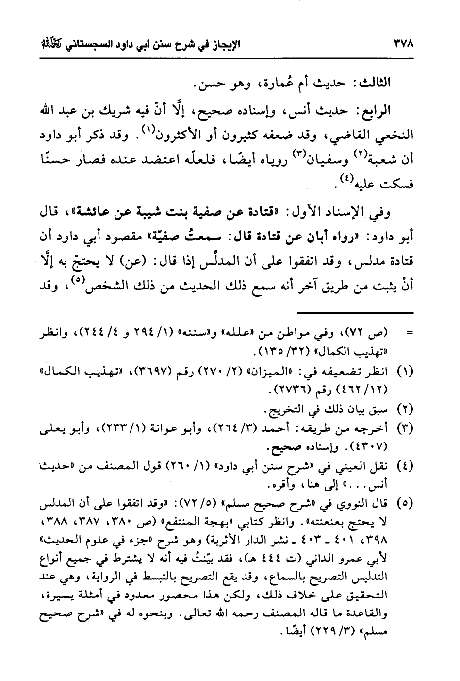 وفي الإسناد الأول: "قتادة عن صفية بنت شيبة عن عائشة"، قال أبو داود: "رواه أبان عن قتادة قال: سمعتُ صفيّة" مقصود أبي داود أن قتادة مدلس، وقد اتفقوا على أن المدلِّس إذا قال: (عن) لا يحتج به إلاَّ أنْ يثبت من طريق آخر أنه سمع ذلك الحديث من ذلك الشخص (¬5)، وقد