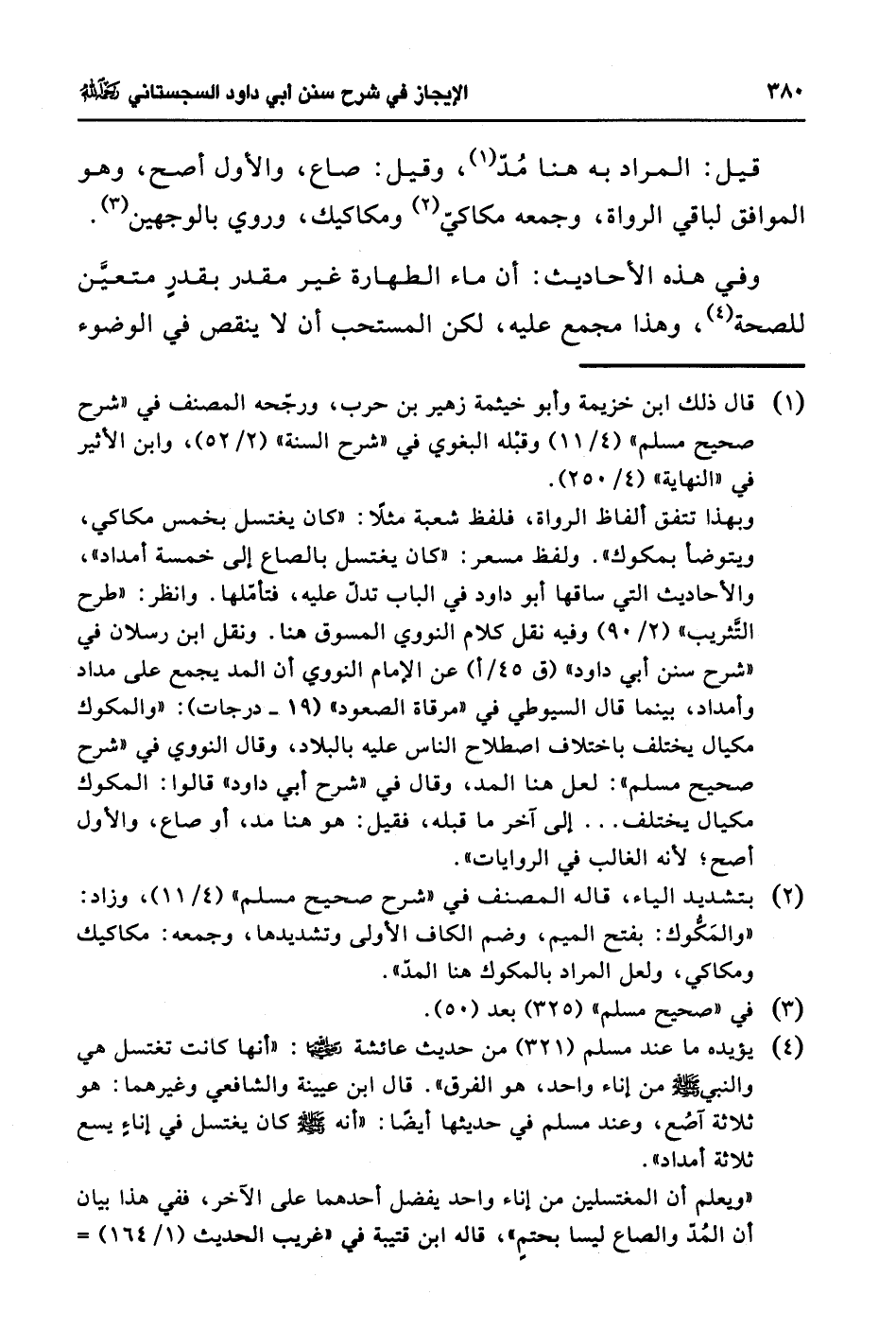 وبهذا تتفق ألفاظ الرواة، فلفظ شعبة مثلاً: "كان يغتسل بخمس مكاكي، ويتوضأ بمكوك". ولفظ مسعر: "كان يغتسل بالصاع إلى خمسة أمداد"، والأحاديث التي ساقها أبو داود في الباب تدل عليه، فتأملها. وانظر: "طرح التَّثريب" (2/ 90) وفيه نقل كلام النووي المسوق هنا. ونقل ابن رسلان في "شرح سنن أبي داود" (ق 45/ أ) عن الإمام النووي أن المد يجمع على مداد وأمداد، بينما قال السيوطي في مرقاة الصعود" (19 - درجات): "والمكوك مكيال يختلف باختلاف اصطلاح الناس عليه بالبلاد، وقال النووي في "شرح صحيح مسلم": لعل هنا المد، وقال في "شرح أبي داود" قالوا: المكوك مكيال يختلف ... إلى آخر ما قبله، فقيل: هو هنا مد، أو صاع، والأول أصح؛ لأنه الغالب في الروايات".