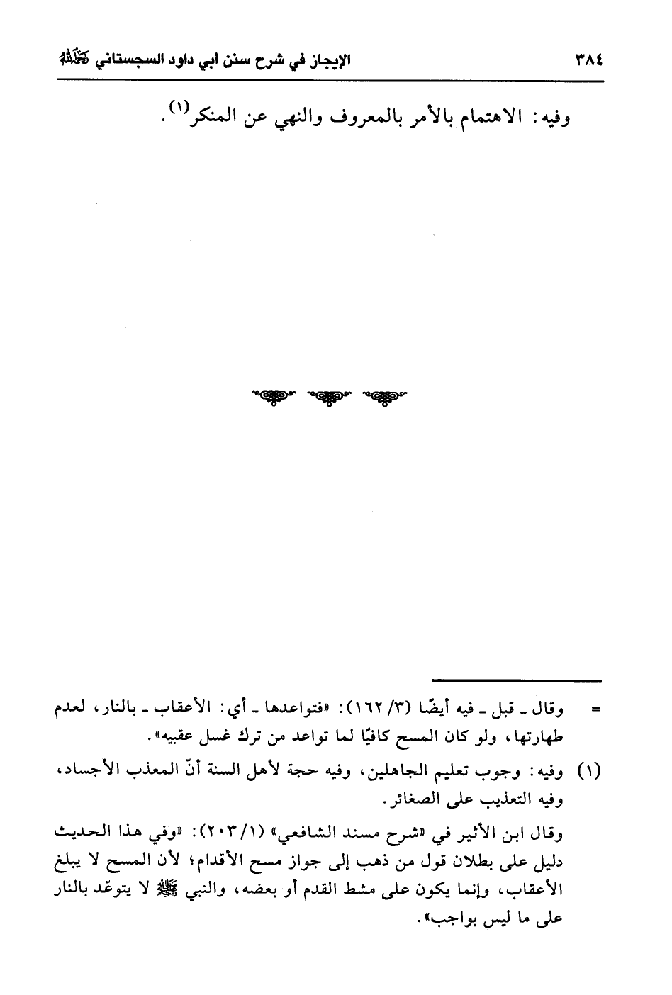 = وقال -قبل- فيه أيضًا (3/ 162): "فتواعدها -أي: الأعقاب- بالنار، لعدم طهارتها، ولو كان المسح كافيًا لما تواعد من ترك غسل عقبيه".
