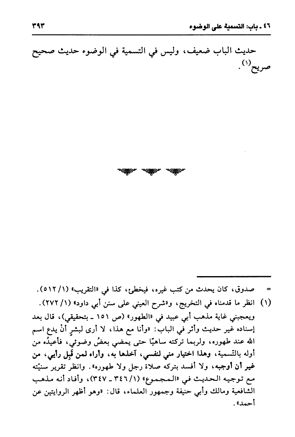 ويعجبني غاية مذهب أبي عبيد في "الطهور" (ص 151 - بتحقيقي)، قال بعد إسناده غير حديث وأثر في الباب: "وأنا مع هذا، لا أرى لبشرٍ أنْ يدع اسم الله عند طهوره، ولربما تركته ساهيًا حتى يمضي بعضُ وضوئي، فأعيدُه من أوله بالتسمية، وهذا اختيار مني لنفسي، آخذها به، وأراه لمن قَبِل رأيي، من غير أن أوجبه، ولا أفسد بتركه صلاة رجل ولا طهوره". وانظر تقرير سنيته مع توجيه الحديث في "المجموع" (1/ 346 - 347)، وأفاد أنه مذهب الشافعية ومالك وأبي حنيفة وجمهور العلماء، قال: "وهو أظهر الروايتين عن أحمد".