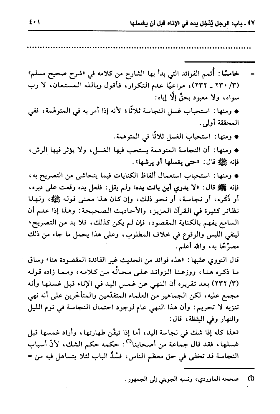 قال النووي عقبها: "هذه فوائد من الحديث غير الفائدة المقصودة هنا" وساق ما ذكره هنا، ووزعنا الزوائد على محاله من كلامه، ومما زاده قوله (3/ 232) بعد تقريره أن النهي عن غمس اليد في الإناء قبل غسلها وأنه مجمع عليه، لكن الجماهير من العلماء المتقدمين والمتأخرين على أنه نهي تنزيه لا تحريم: وأن هذا النهي عام لوجود احتمال النجاسة في نوم الليل والنهار وفي اليقظة، قال: